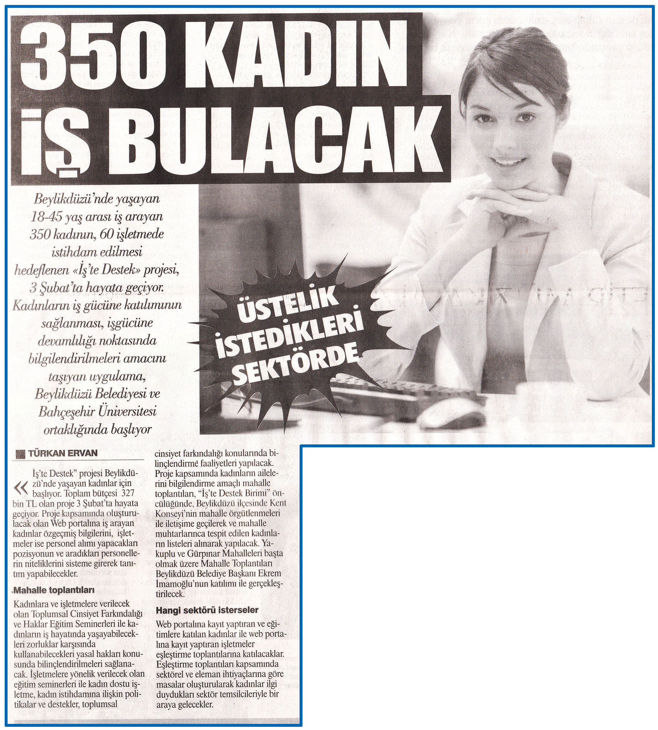 28 Ocak 2016 tarihli "GAZETE İSTANBUL" gazetesi. Beylikdüzü'nde yaşayan 18-45 yaş arası iş arayan 350 kadının, 60 işletmede istihdam edilmesi hedeflenen "İş'te Destek" projesi, 3 Şubat'ta hayata geçiyor.