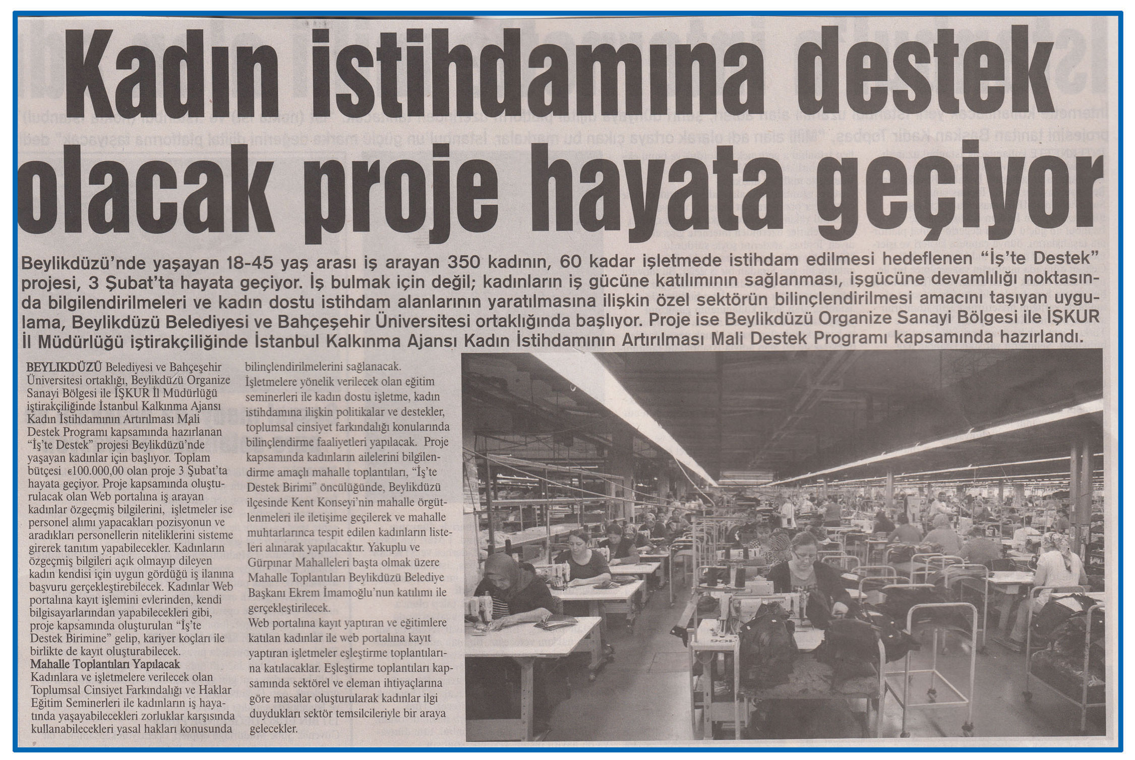 28 Ocak 2016 tarihli "MARMARA" gazetesi. Beylikdüzü'nde yaşayan 18-45 yaş arası iş arayan 350 kadının, 60 kadar işletmede istihdam edilmesi hedeflenen "İş'te Destek" projesi, 3 Şubat'ta hayata geçiyor.