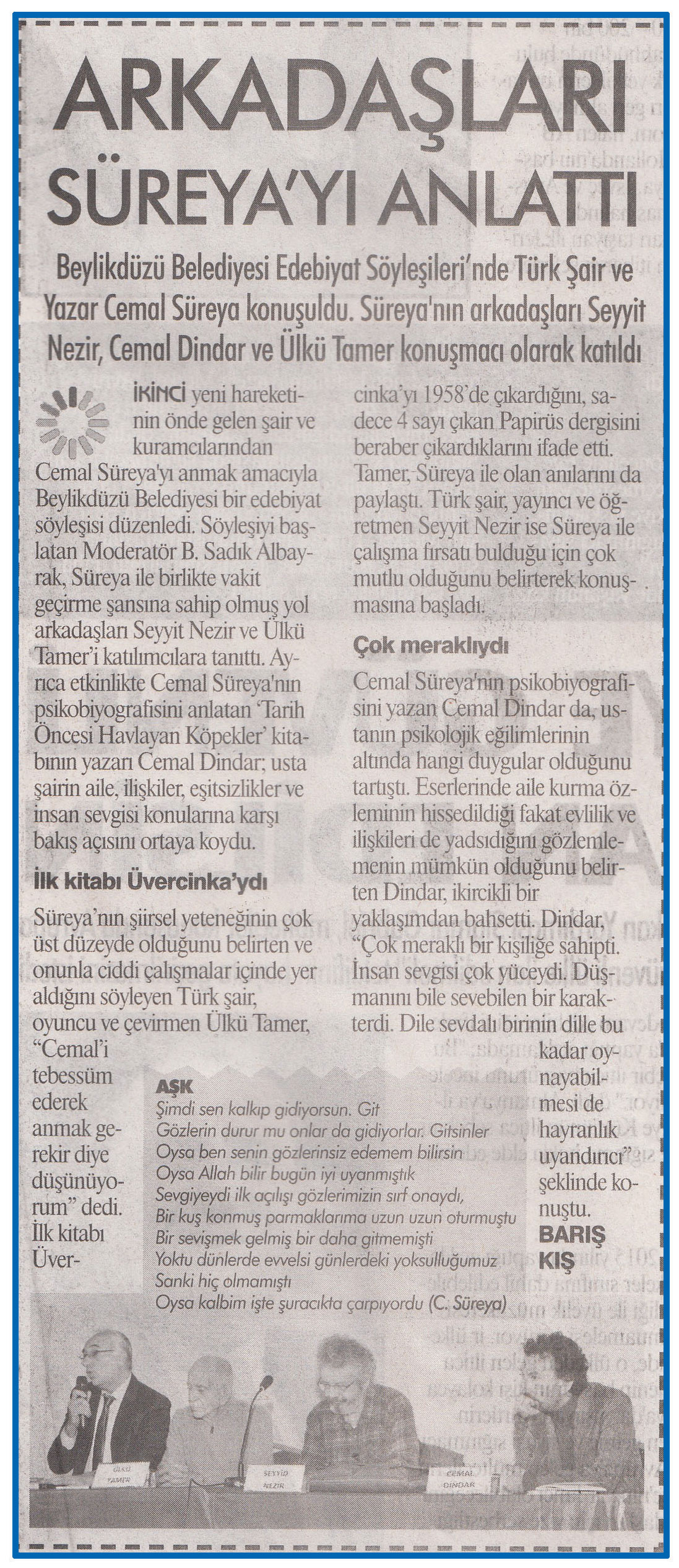 29 Ocak 2016 tarihli "GAZETE İSTANBUL" gazetesi. Beylikdüzü Belediyesi Edebiyat Söyleşileri'nde Türk Şair ve Yazar Cemal Süreya konuşuldu. Süreya'nın arkadaşları Seyyit Nezir, Cemal Dindar ve Ülkü Tamer konuşmacı olarak katıldı.