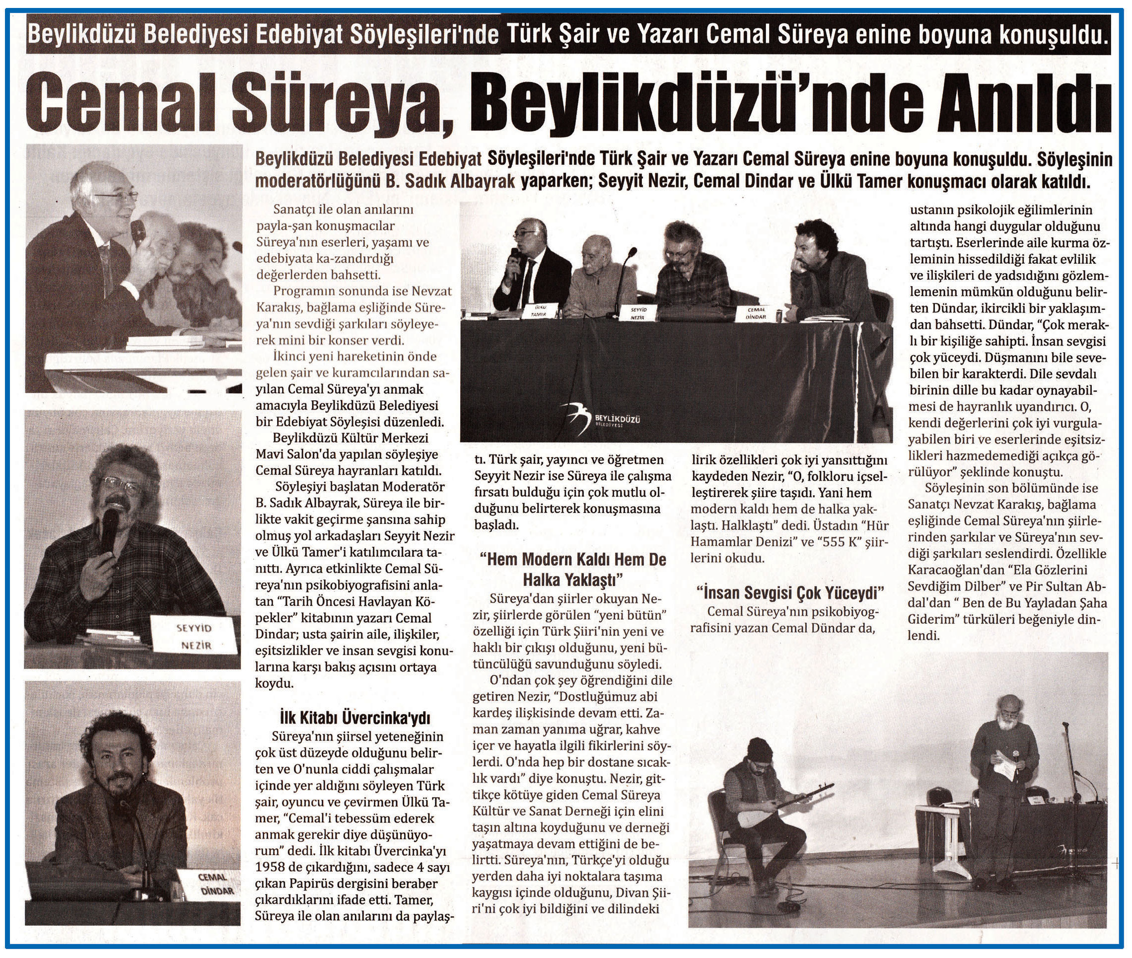 1 Şubat 2016 tarihli "YANKI" gazetesi. Beylikdüzü Belediyesi Edebiyat Söyleşileri'nde Türk Şair ve Yazarı Cemal Süreya enine boyuna konuşuldu. Söyleşinin moderatörlüğünü B. Sadık Albayrak yaparken; Seyyit Nezir, Cemal Dindar ve Ülkü Tamer konuşmacı olarak katıldı.