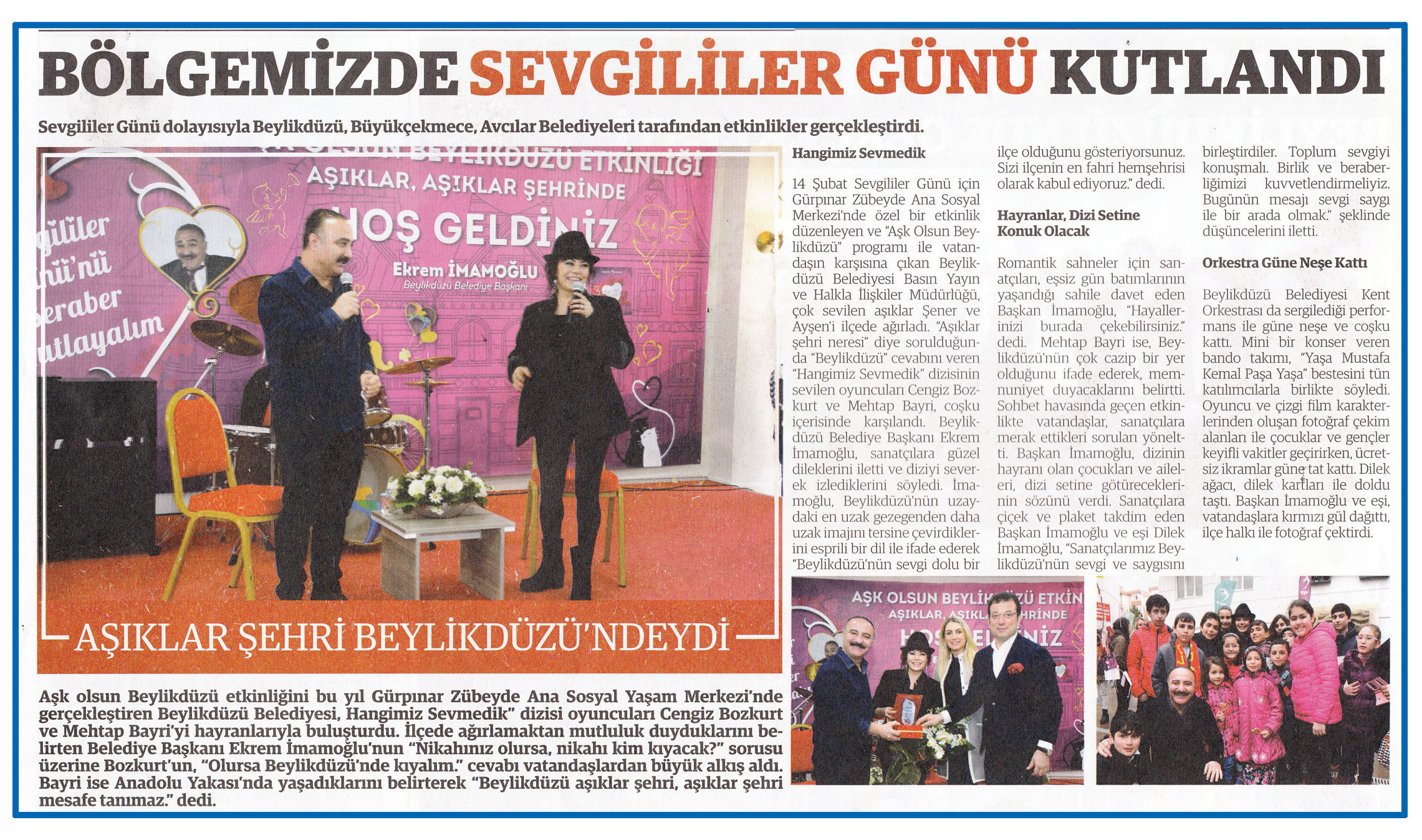 8 Mart 2017 tarihli "HABER LONCA" Gazetesi. 14 Şubat Sevgililer Günü için Gürpınar Zübeyde Ana Sosyal Merkezi'nde özel bir etkinlik düzenlendi. Beylikdüzü Belediyesi, "Aşk Olsun Beylikdüzü" adı verilen etkinlik kapsamında , "Hangimiz Sevmedik" dizisi oyuncuları Cengiz Bozkurt ve Mehtap Bayri'yi hayranlarıyla buluşturdu.