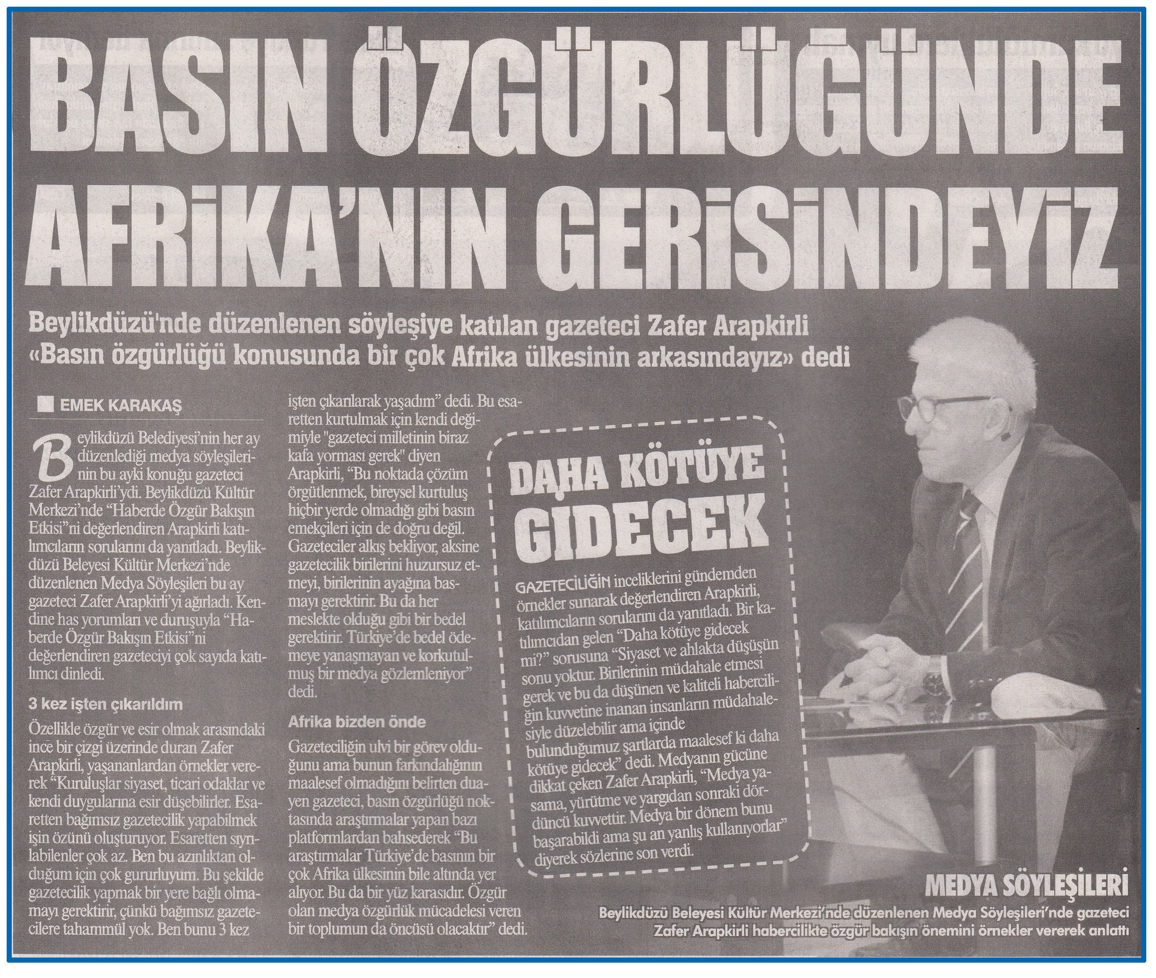 3 Şubat 2016 tarihli "GAZETE İSTANBUL" gazetesi. Beylikdüzü'nde düzenlenen söyleşiye katılan gazeteci Zafer Arapkirli "Basın özgürlüğü konusunda bir çok Afrika ülkesinin arkasındayız" dedi.