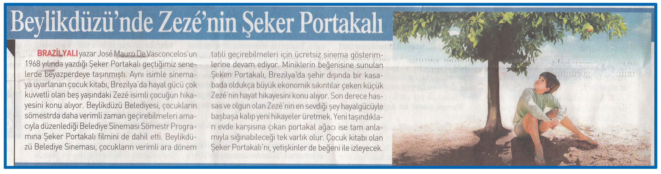 3 Şubat 2016 tarihli "YERELKULİS" gazetesi. Brazilya yazar Jose Mauro De Vasconcelos'un 1968 yılında yalında yazdığı Şeker Portakalı geçtiğimiz senelerde beyazperdeye taşınmıştı. Brezilya'da hayal gücü çok kuvvetli olan beş yaşındaki Zeze isimli çocuğun hikayesini konu alıyor.