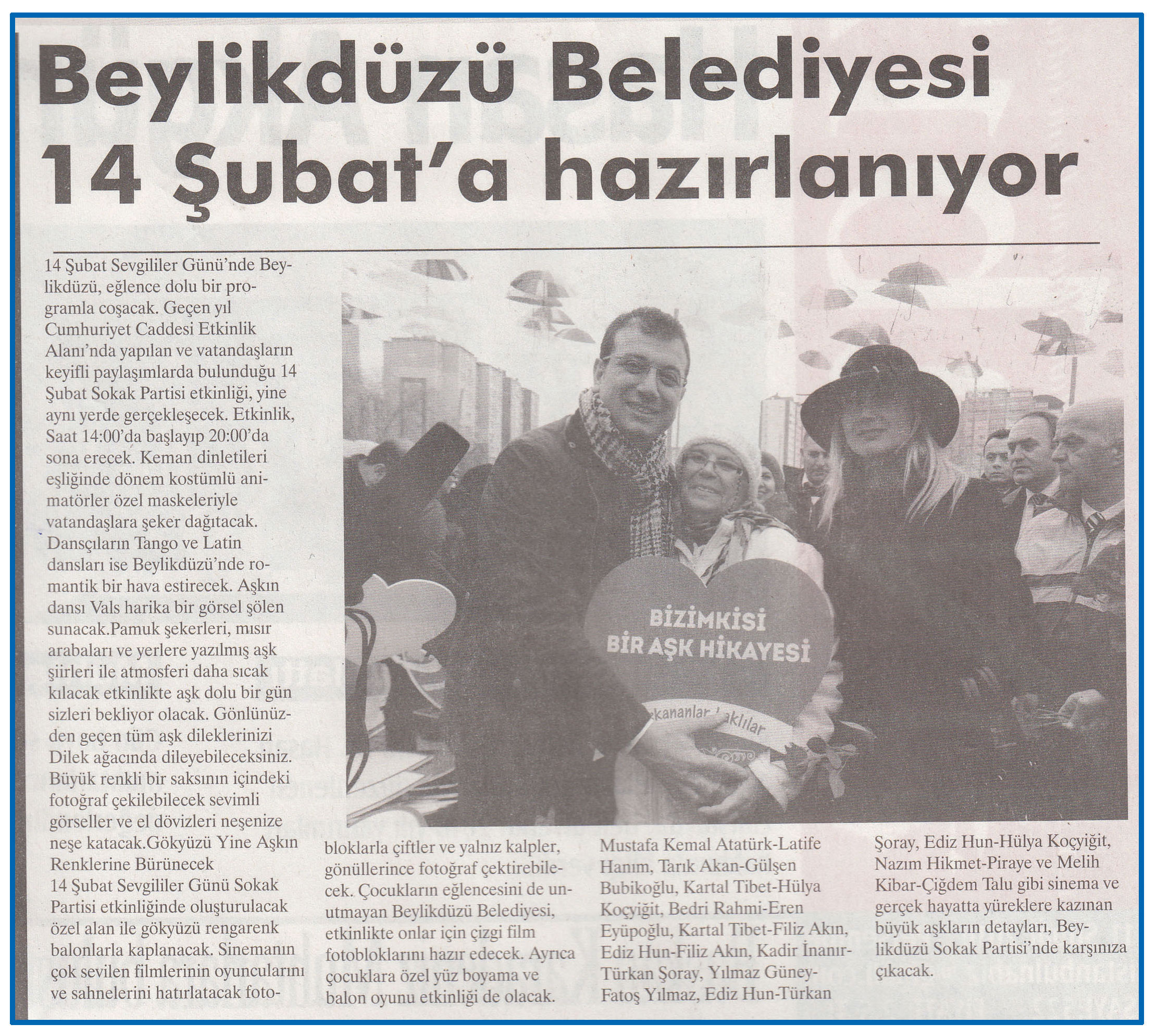 11 Şubat 2016 tarihli "NABIZ" gazetesi. 14 Şubat Sevgililer Günü'nde Beylikdüzü, eğlence dolu bir programla coşacak. Geçen yıl Cumhuriyet Caddesi Etkinlik Alanı'nda yapılan ve vatandaşların keyifli paylaşımlarda bulunduğu 14 Şubat Sokak Partisi etkinliği, yine aynı yerde gerçekleşecek.
