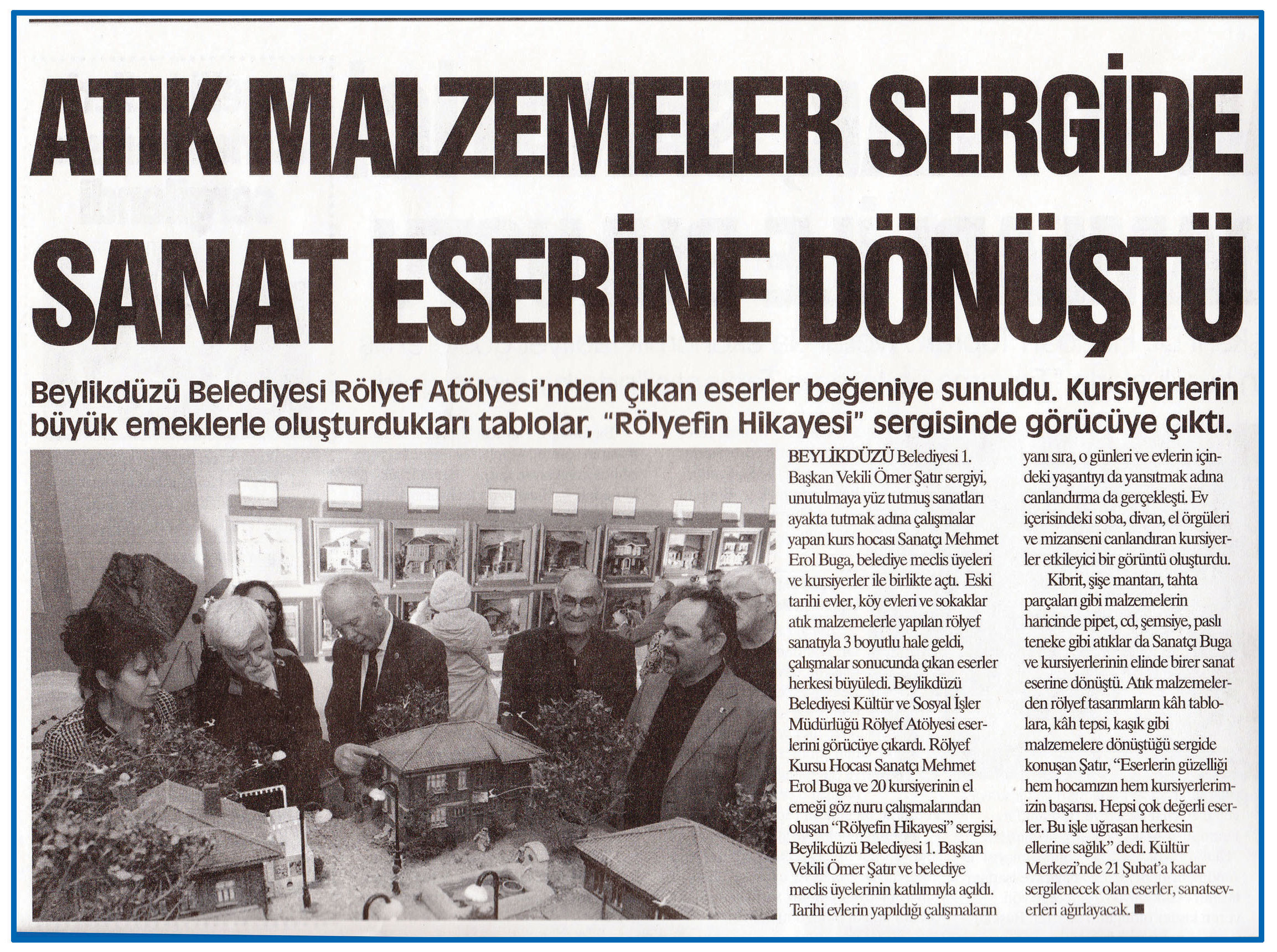 15 Şubat 2016 tarihli "MEDYA" gazetesi. Beylikdüzü Belediye Rölyef Atölyesi'nden çıkan eserler beğeniye sunuldu. Kursiyerlerin büyük emeklerle oluşturdukları tablolar, "Rölyefin Hikayesi" sergisinde görücüye çıktı.