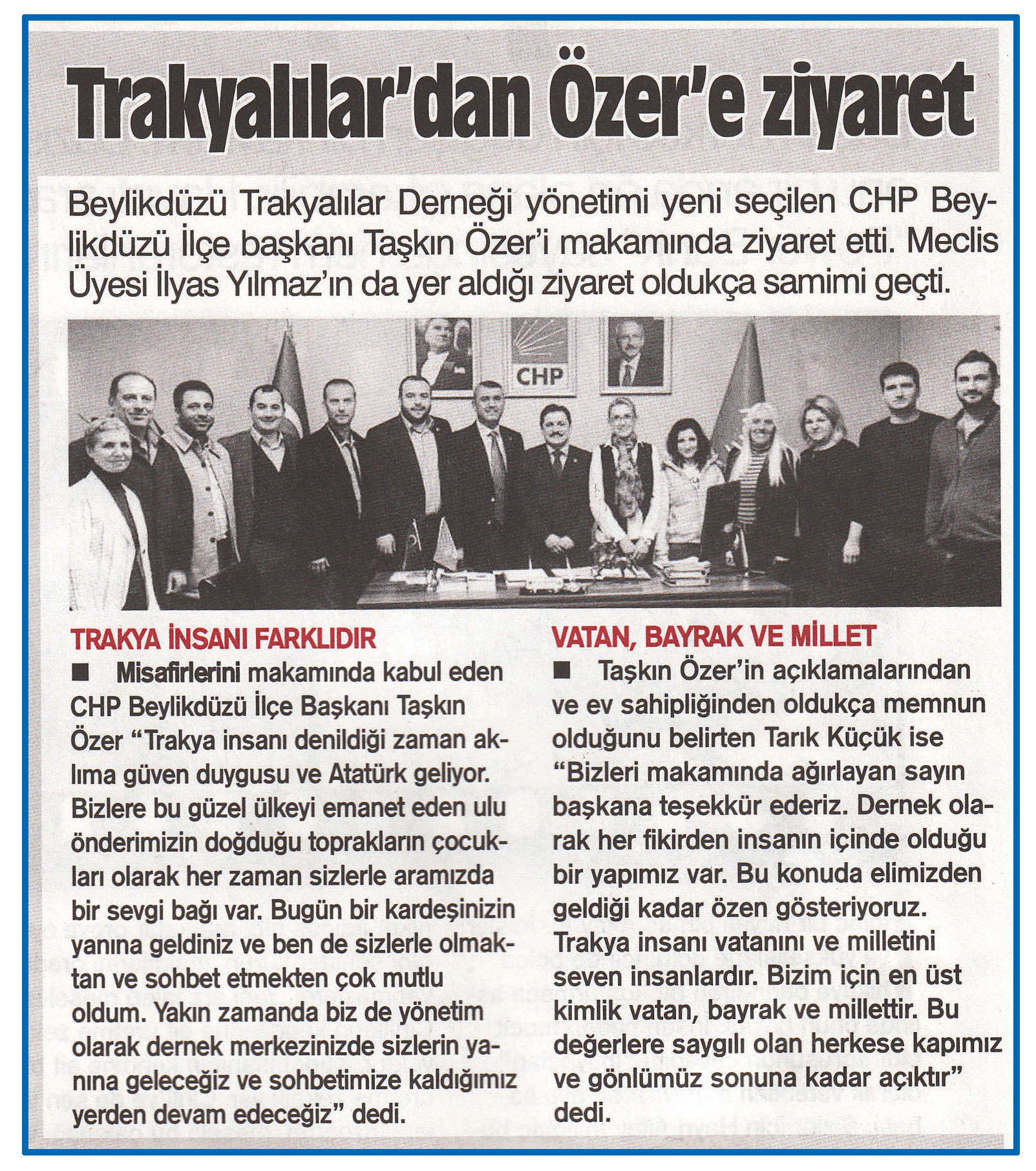 16 Şubat 2016 tarihli "GAZETE CADDE" gazetesi. Beylikdüzü Trakyalılar Derneği yönetimi yeni seçilen CHP Beylikdüzü İlçe Başanı Taşkın Özer'i makamında ziyaret etti. Meclis Üyesi İlyas Yılmaz'ın da yer aldığı ziyaret oldukça samimi geçti.