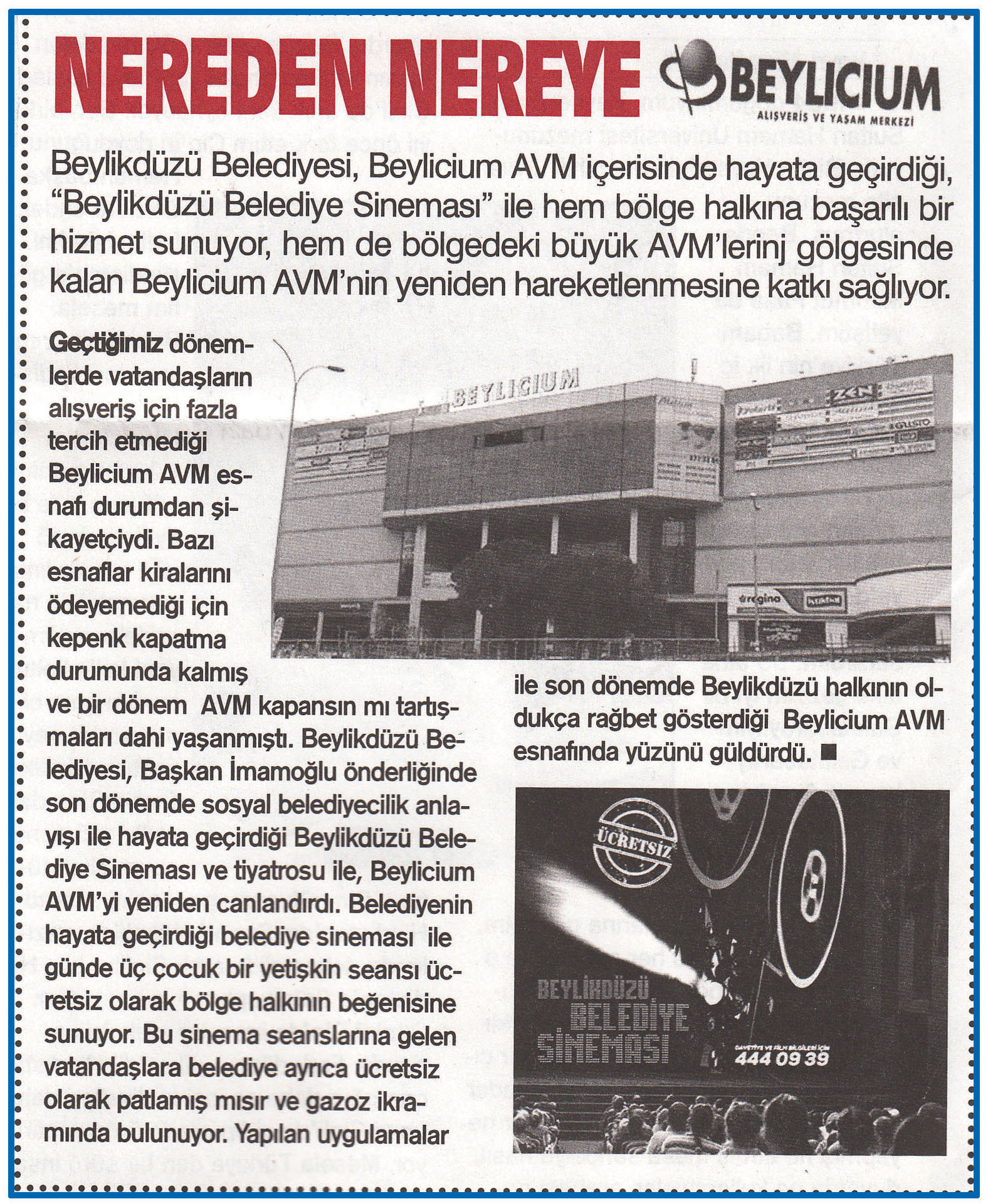 16 Şubat 2016 tarihli "GAZETE CADDE" gazetesi. Beylikdüzü Belediyesi, Beylicium AVM içerisinde hayata geçirdiği, "Beylikdüzü Belediye Sineması" ile hem bölge halkına başarılı bir hizmet sunuyor, hem de bölgedeki büyük AVM'lerin gölgesinde kalan Beylicium AVM'nin yeniden hareketlenmesine katkı sağlıyor.