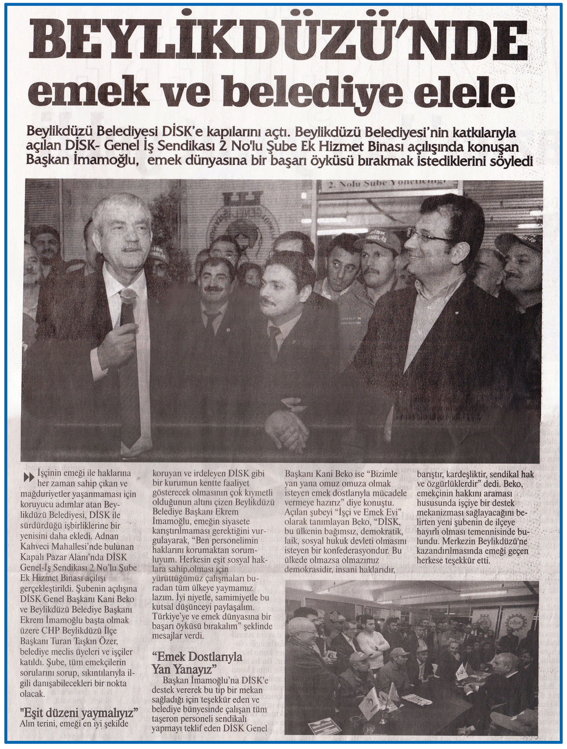 22 Şubat 2016 tarihli "ANAHABER" gazetesi. Beylikdüzü Belediyesi DİSK'e kapılarını açtı. Beylikdüzü Belediyesi'nin katkılarıyla açılan DİSK Genel İş Sendikası 2 No'lu Şube Ek Hizmet Binası açılışında konuşan Başkan İmamoğlu, emek dünyasına bir başarı öyküsü bırakmak istediklerini söyledi.