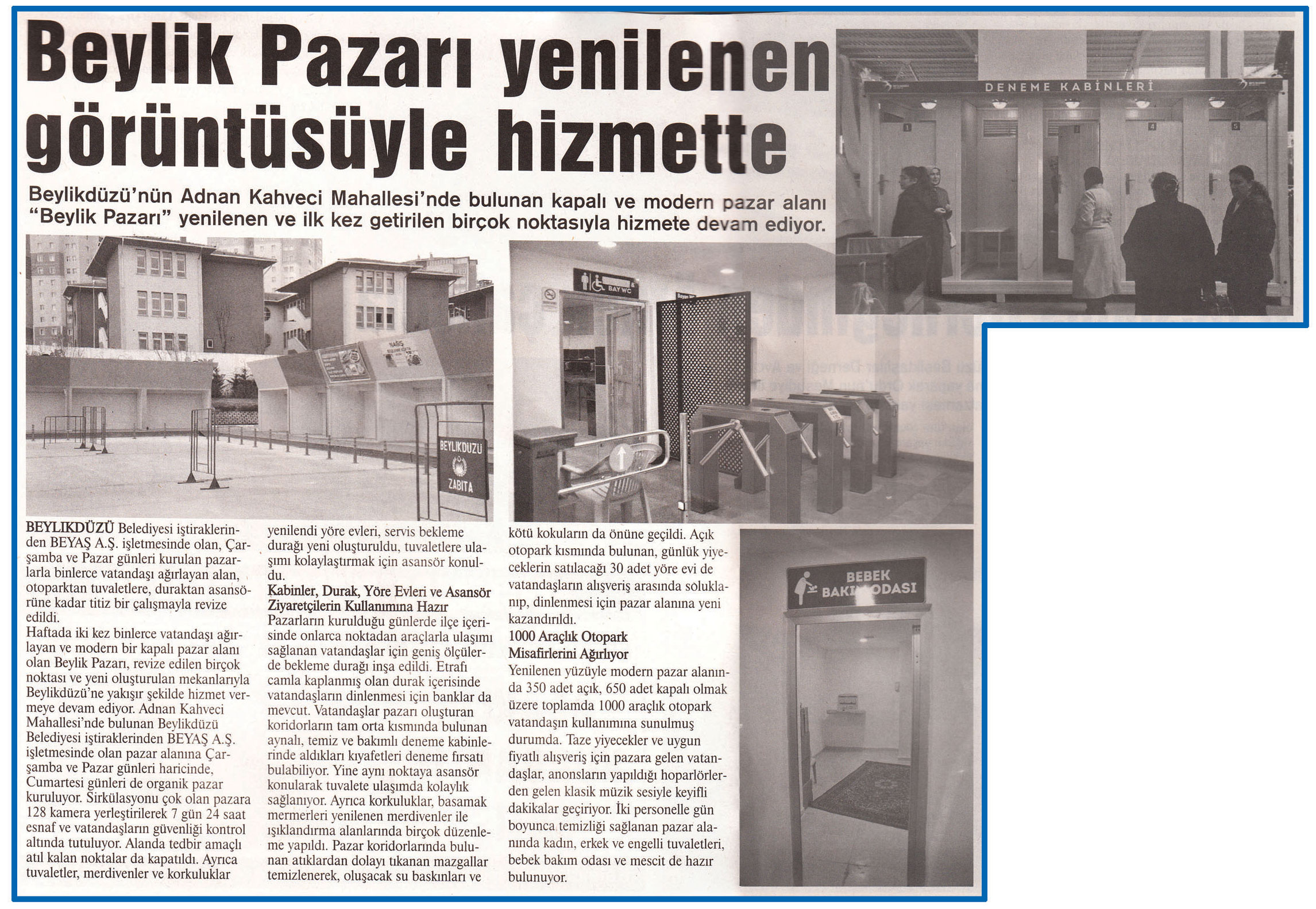 22 Şubat 2016 tarihli "MARMARA" gazetesi. Beylikdüzü'nün Adnan Kahveci Mahallesi'nde bulunan kapalı ve modern pazar alanı "Beylik Pazar" yenilenen ve ilk kez getirilen birçok noktasıyla hizmete devam ediyor.