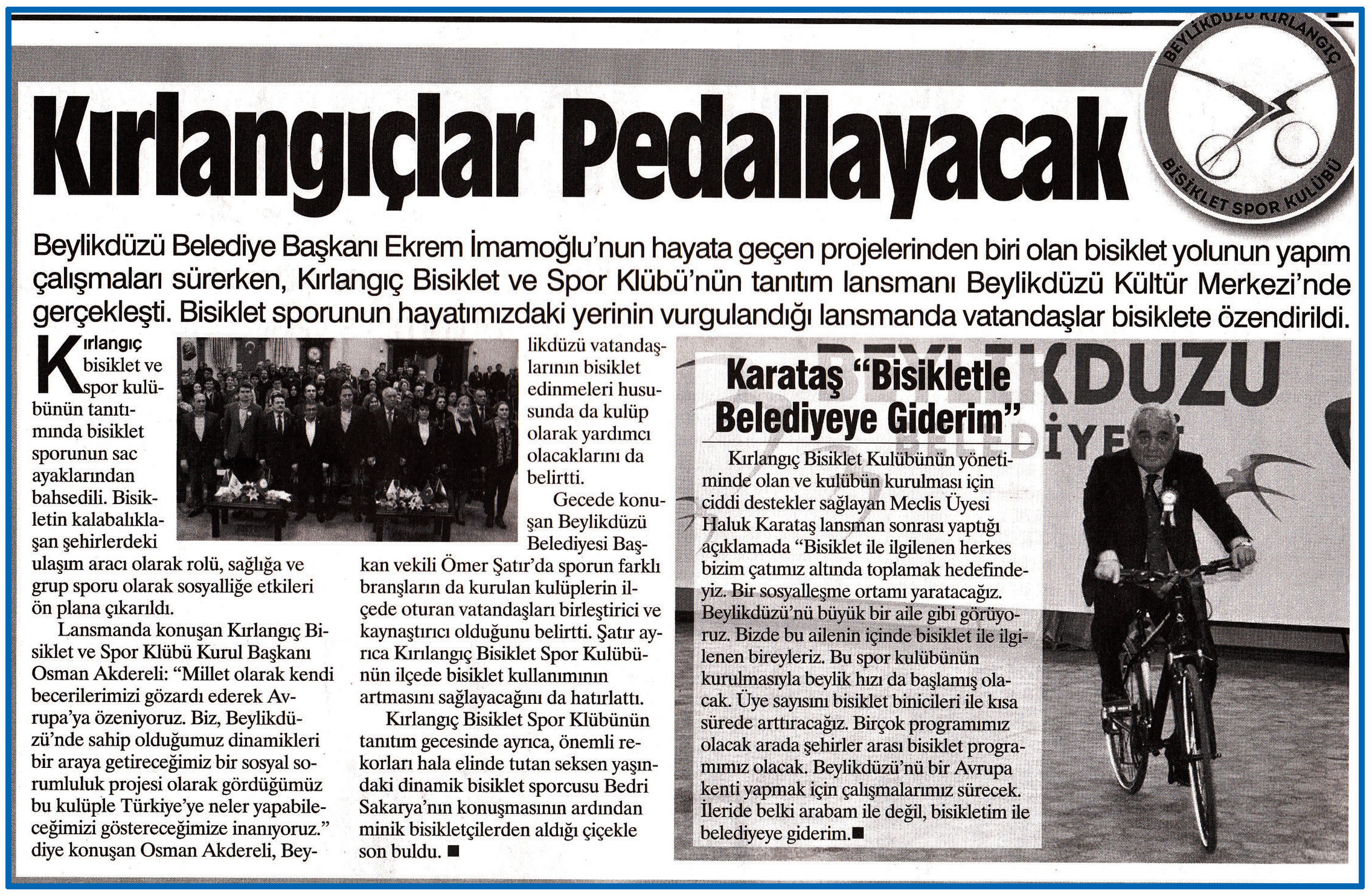29 Şubat 2016 tarihli "GAZETE CADDE" gazetesi. Beylikdüzü Belediye Başkanı Ekrem İmamoğlu'nun hayata geçen projelerinden biri olan bisiklet yolunun yapım çalışmaları sürerken, Kırlangıç Bisiklet ve Spor Kulübü'nün tanıtım lansmanı Beylikdüzü Kültür Merkezi'nde gerçekleşti. Bisiklet sporunun hayatımızdaki yerinin vurgulandığı lansmanda vatandaşlar bisiklete özendirildi.
