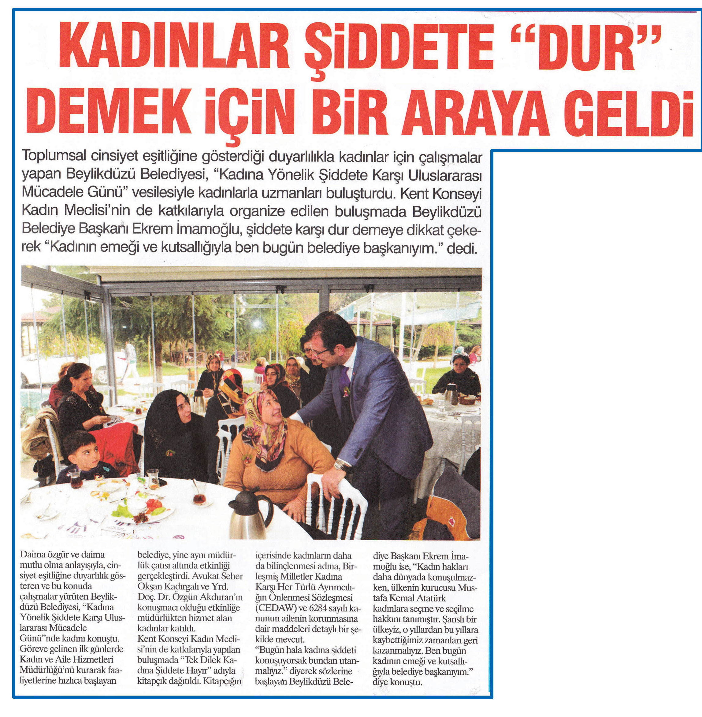 1 Aralık 2016 tarihli "ZEYNA" gazetesi. Toplumsal cinsiyet eşitliğine gösterdiği duyarlılıkla kadınlar için çalışmalar yapan Beylikdüzü Belediyesi, "Kadına Yönelik Şiddete Karşı Uluslararası Mücadele Günü" vesilesiyle kadınlarla uzmanları buluşturdu.