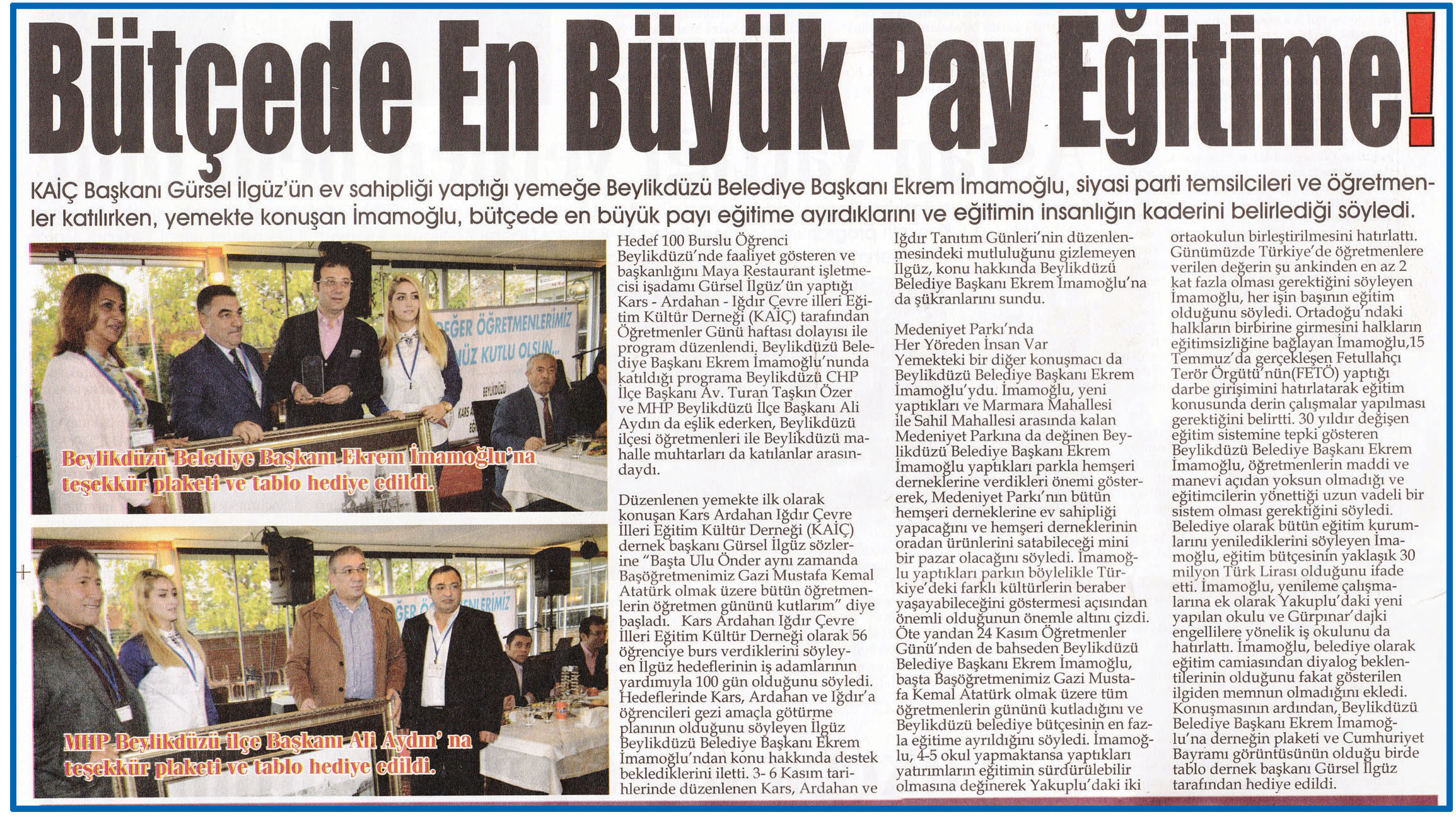2 Aralık 2016 tarihli "BEYLİKDÜZÜ" gazetesi. KAİÇ Bşkanı Gürsel İlgüz'ün evsahipliği yaptığı yemeğe Beylikdüzü Belediye Başkanı Ekrem İmamoğlu, siyasi parti temsilcileri ve öğretmenler katılırken, yemekte konuşan İmamoğlu, bütçede en büyük payı eğitime ayırdıklarını ve eğitimin insanlığın kaderini belirlediğini söyledi.