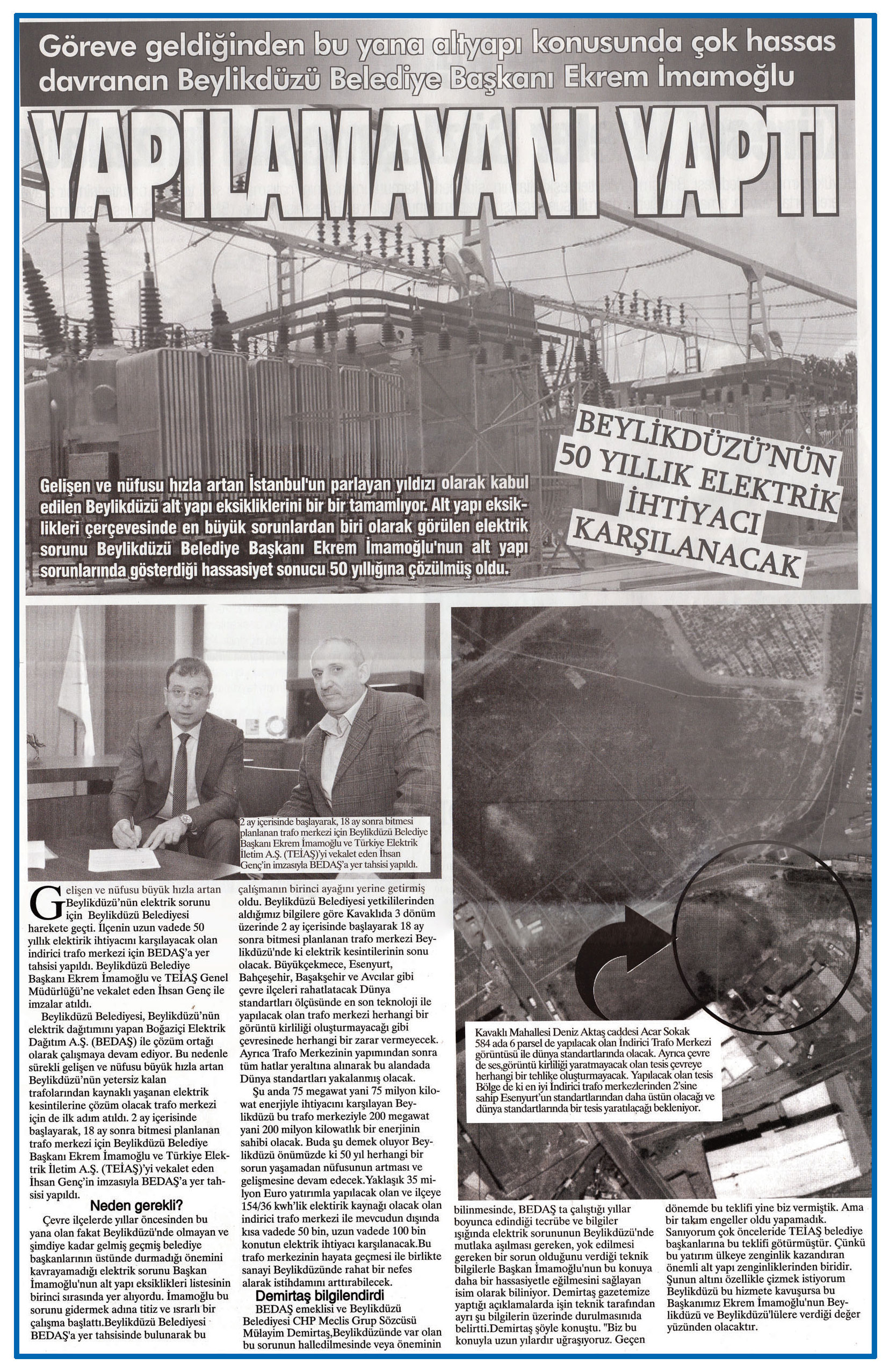1 Mart 2016 tarihli "MEDYA" gazetesi. Gelişen ve nüfusu hızla artan İstanbul'un parlayan yıldızı olarak kabul edilen Beylikdüzü alt yapı eksiklikerini bir bir tamamlıyor. Alt yapı eksiklikleri çerçevesinde en büyük sorunlardan biri olarak görülen elektrik sorunu Beylikdüzü Belediye Başkanı Ekrem İmamoğlu'nun alt yapı sorunlarında gösterdiği hassasiyet sonucu 50 yıllığına çözülmüş oldu.