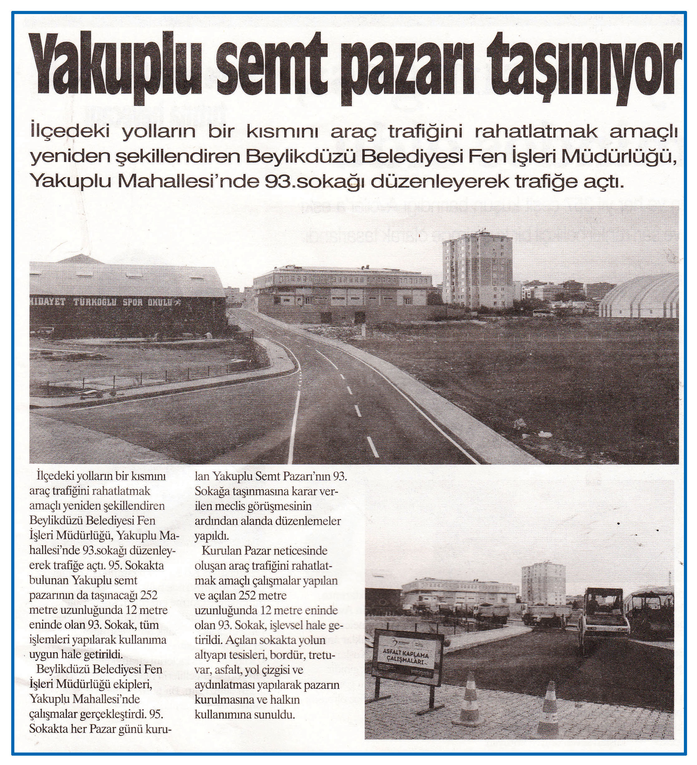 7 Aralık 2016 tarihli "NABIZ" gazetesi. İlçedeki yolların bir kısmını araç trafiğini rahatlatmak amaçlı yeniden şekillendiren Beylikdüzü Belediyesi Fen İşleri Müdürlüğü, Yakuplu Mahallesi'nde 93. sokağı düzenleyerek trafiğe açtı.