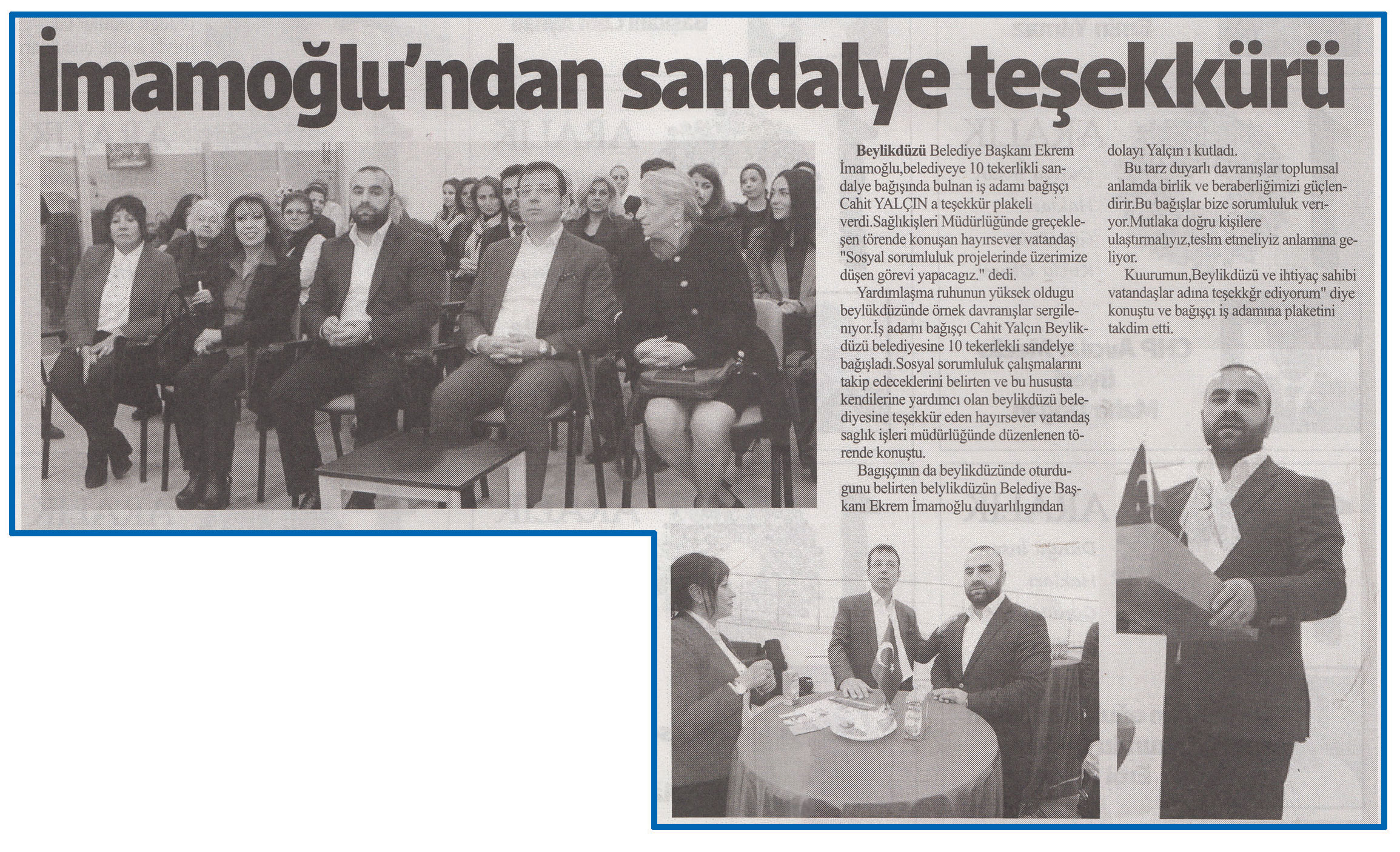 12 Aralık 2016 tarihli "HABER YAPIYORUM" gazetesi. Beylikdüzü Belediye Başkanı Ekrem İmamoğlu, belediyeye 10 tekerlekli sandalye bağışında bulunan iş adamı bağışçı Cahit YALÇIN'a teşekkür plaketi verdi. İmamoğlu, " Bu tar duyarlı davranışlar toplumsal anlamda birlik ve beraberliğimizi güçlendirir. Mutlaka doğru kişilere ulaştırmalıyız, teslim etmeliyiz anlamına geliyor" diyerek hayırsever vatandaşa teşekkür etti.