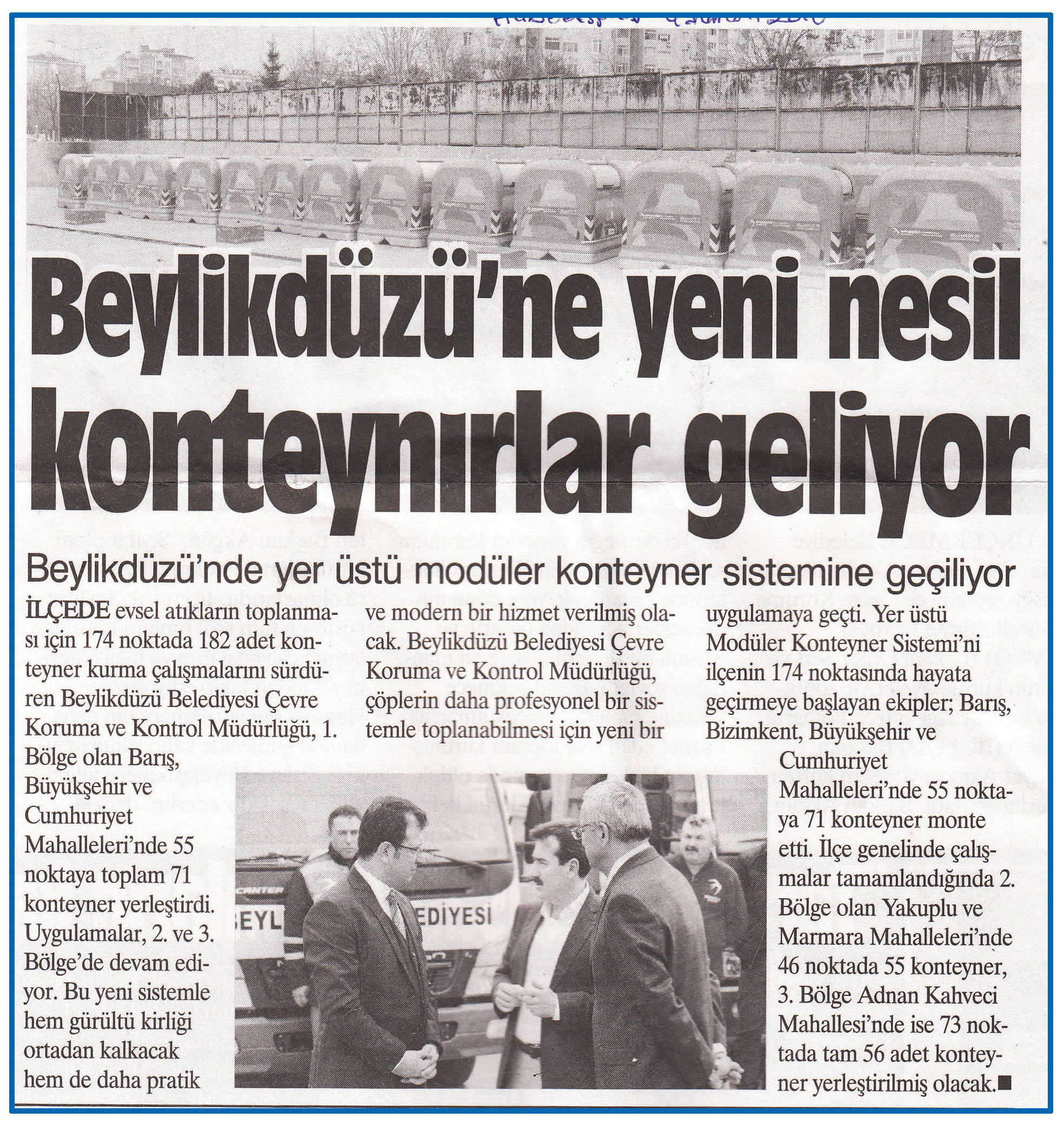 4 Mart 2016 tarihli "HABER ESKPRESS" gazetesi. Beylikdüzü'nde yer üstü modüle konteyner sistemine geçiliyor. İlçede evsel atıkların toplanması için 174 noktada 182 adet konteynır kurma çalışmalarını sürdüren Beylikdüzü Belediyesi Çevre Koruma ve Kontrol Müdürlüğü, 1. Bölge olan Barış Büyükşehir ve Cumhuriyet Mahalleleri'nde 55 noktaya toplam 71 konteyner yerleştirdi.