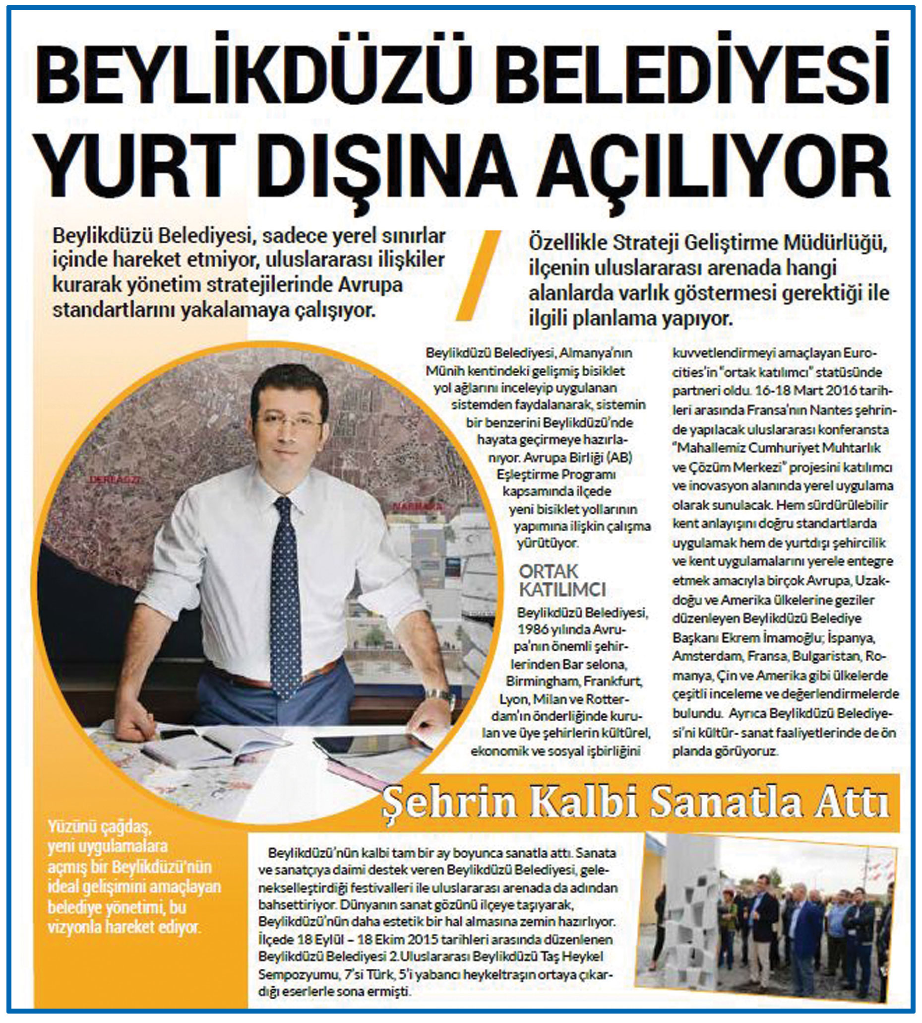 4 Mart 2016 tarihli "MARMARA HABER" gazetesi. Beylikdüzü Belediyesi sadece yerel sınırlar içinde hareket etmiyor, uluslararası ilişkiler kurarak yönetim stratejilerinde Avrupa standartlarını yakalamaya çalışıyor.