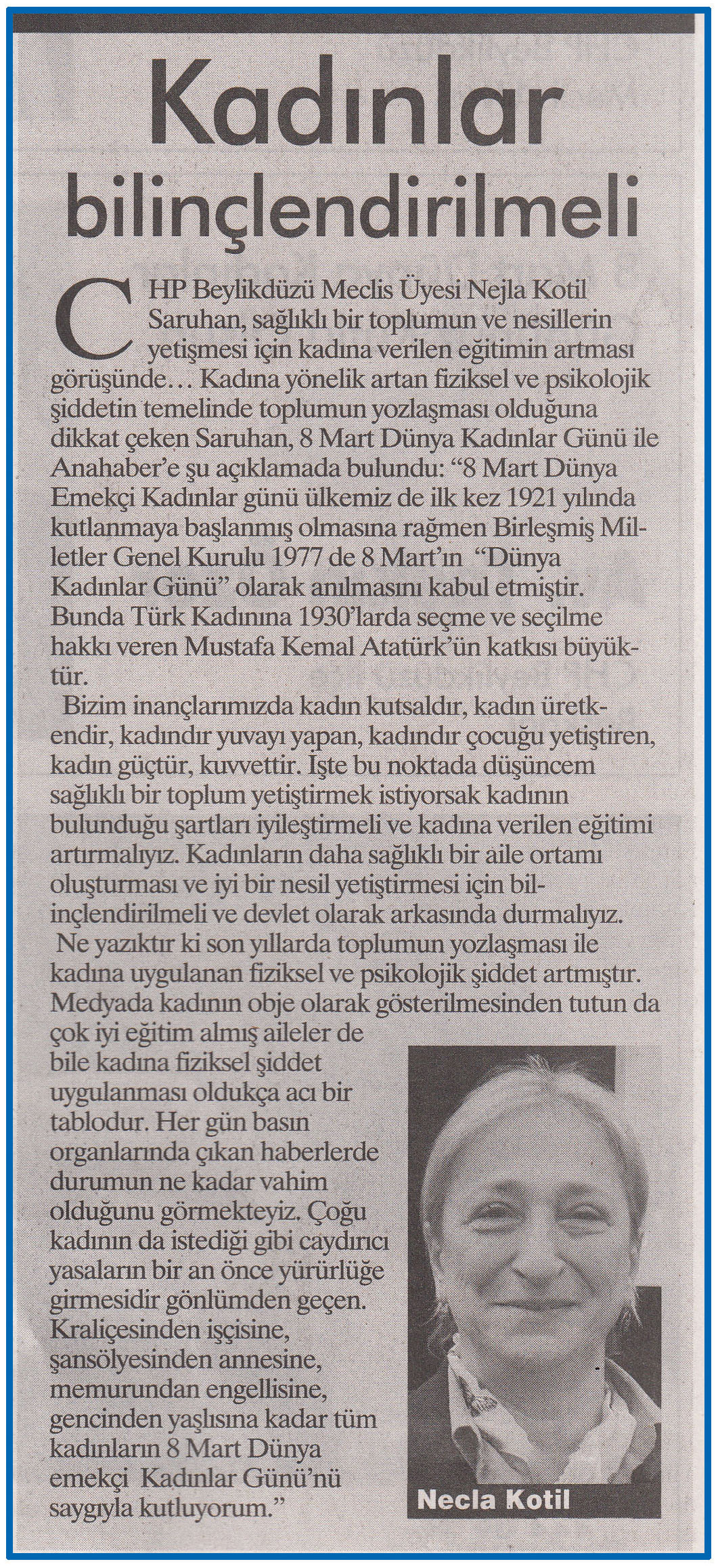 8 Mart 2016 tarihli "ANAHABER" gazetesi. CHP Beylikdüzü Meclis Üyesi Nejla Kotil Saruhan, sağlıklı bir toplumun ve nesillerin yetişmesi için kadına verilen eğitimin artması görüşünde...