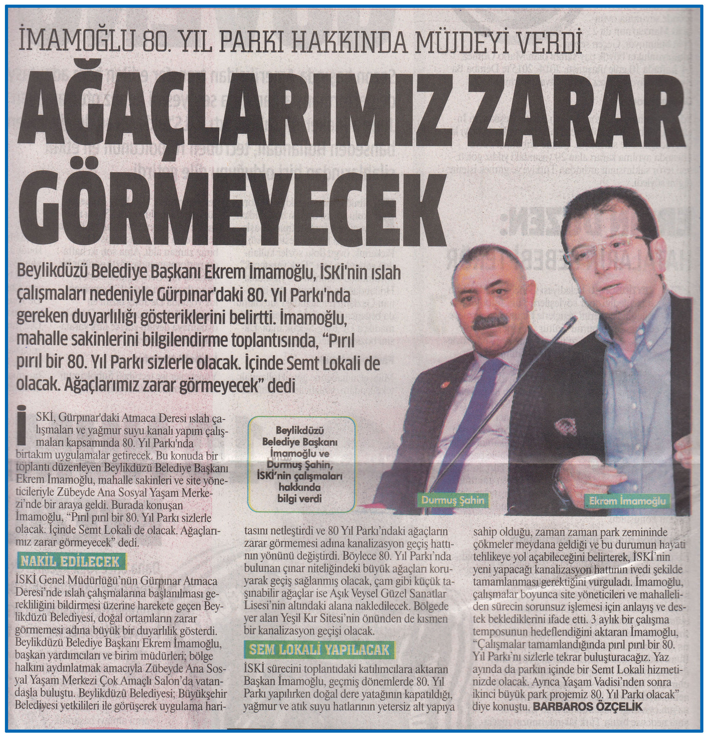 16 Aralık 2016 tarihli "GAZETEMİSTANBUL" gazetesi. Beylikdüzü Belediye Başkanı Ekrem İmamoğlu, İSKİ'nin ıslah çalışmaları nedeniyle Gürpınar'daki 80. Yıl Parkı'nda gereken duyarlılığı gösterdiklerini belirtti. İmamoğlu, mahalle sakinlerini bilgilendirme toplantısında, "Pırıl pırıl bir 80. Yıl Parkı sizlerle olacak. İçinde Semt Kolali de olacak. Ağaçlarımız zarar görmeyecek" dedi.