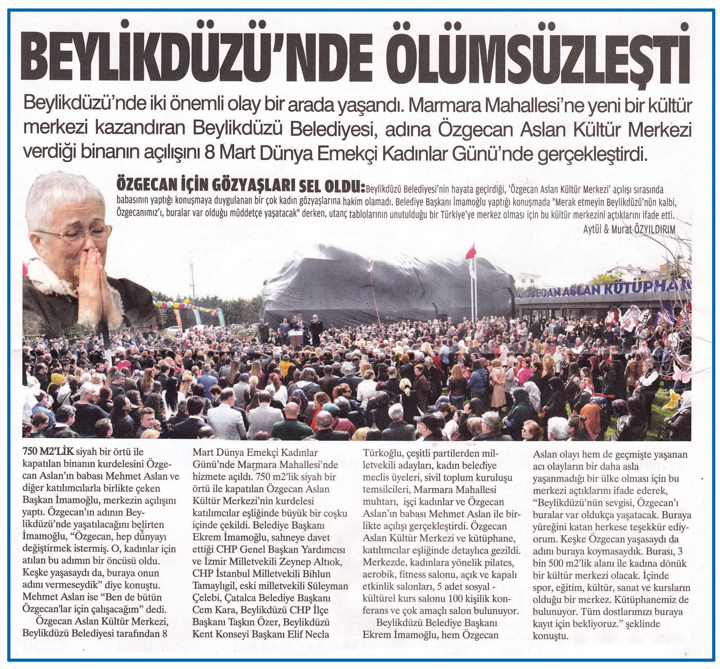 9 Mart 2016 tarihli "HABER EKSPRESS" gazetesi. Beylikdüzü'nde iki önemli olay bir arada yaşandı. Marmara Mahallesi'ne yeni kültür merkezi kazandıran Beylikdüzü Belediyesi, adına Özgecan Aslan Kültür Merkezi verdiği binanın açılışını 8 Mart Dünya Emekçi Kadınlar Günü'nde gerçekleştirdi.