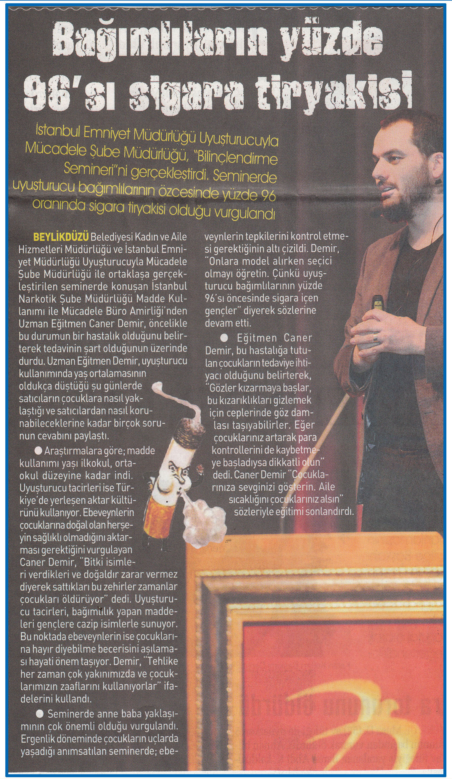 14 Mart 2016 tarihli "YERELKULİS" gazetesi. İstanbul Emliyet Müdürlüğü Uyuşturucuyla Mücadele Şube Müdürlüğü, "Bilinçlendirme Semineri"ni gerçekleştirdi. Seminerde uyuşturucu bağımlılarının özcesinde yüzde 96 oranında sigara tiryakisi olduğu vurgulandı.