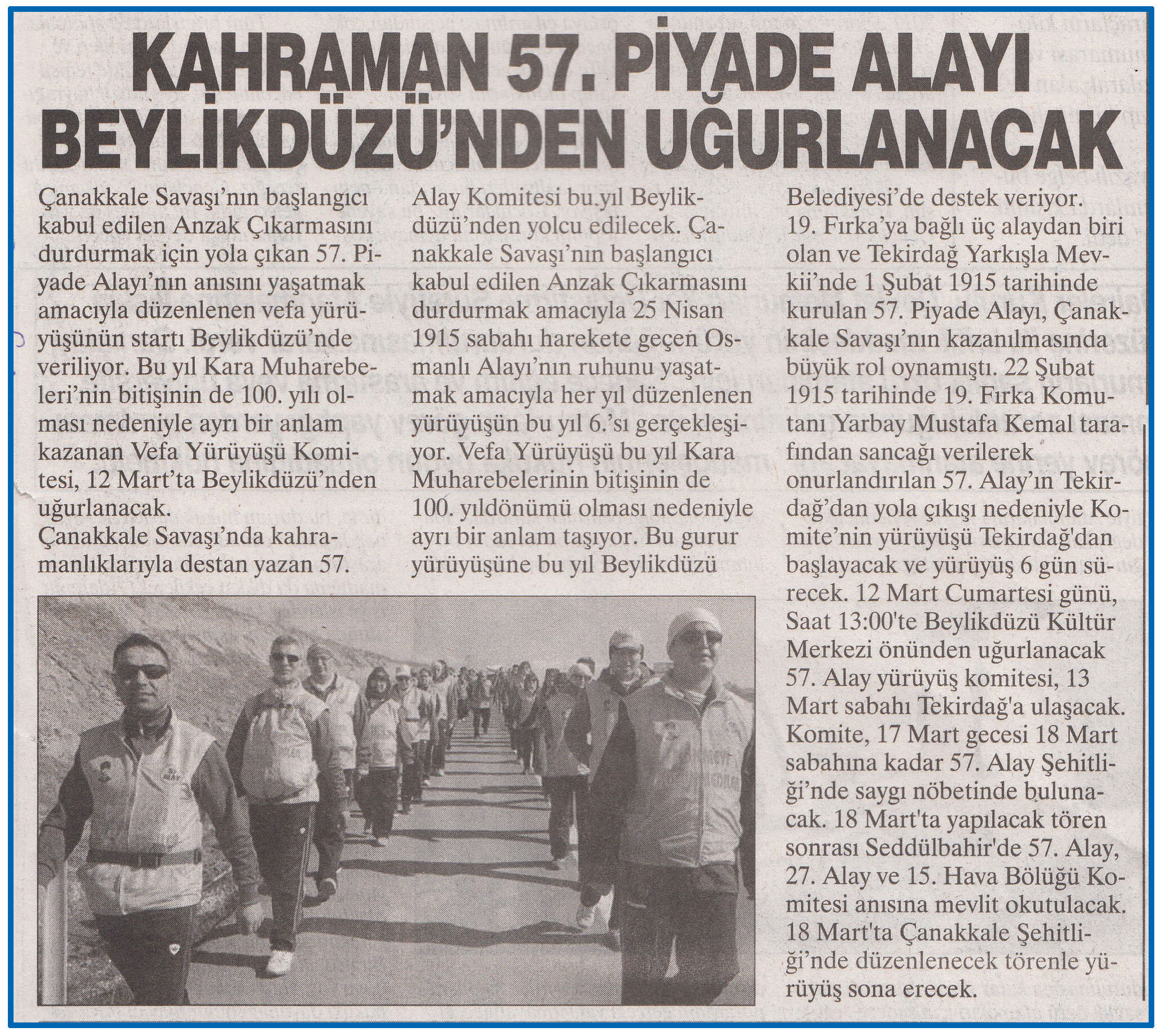 11 Mart 2016 tarihli "BÜYÜKÇEKMECE" gazetesi. Çanakkale Savaşı'nın başlangıcı kabul edilen Anzak Çıkarmasını durdurmak için yola çıkan 57. Piyade Alayı'nın anısını yaşatmak amacıyla düzenlenen vefa yürüyüşünün startı Beylikdüzü'nde veriliyor.