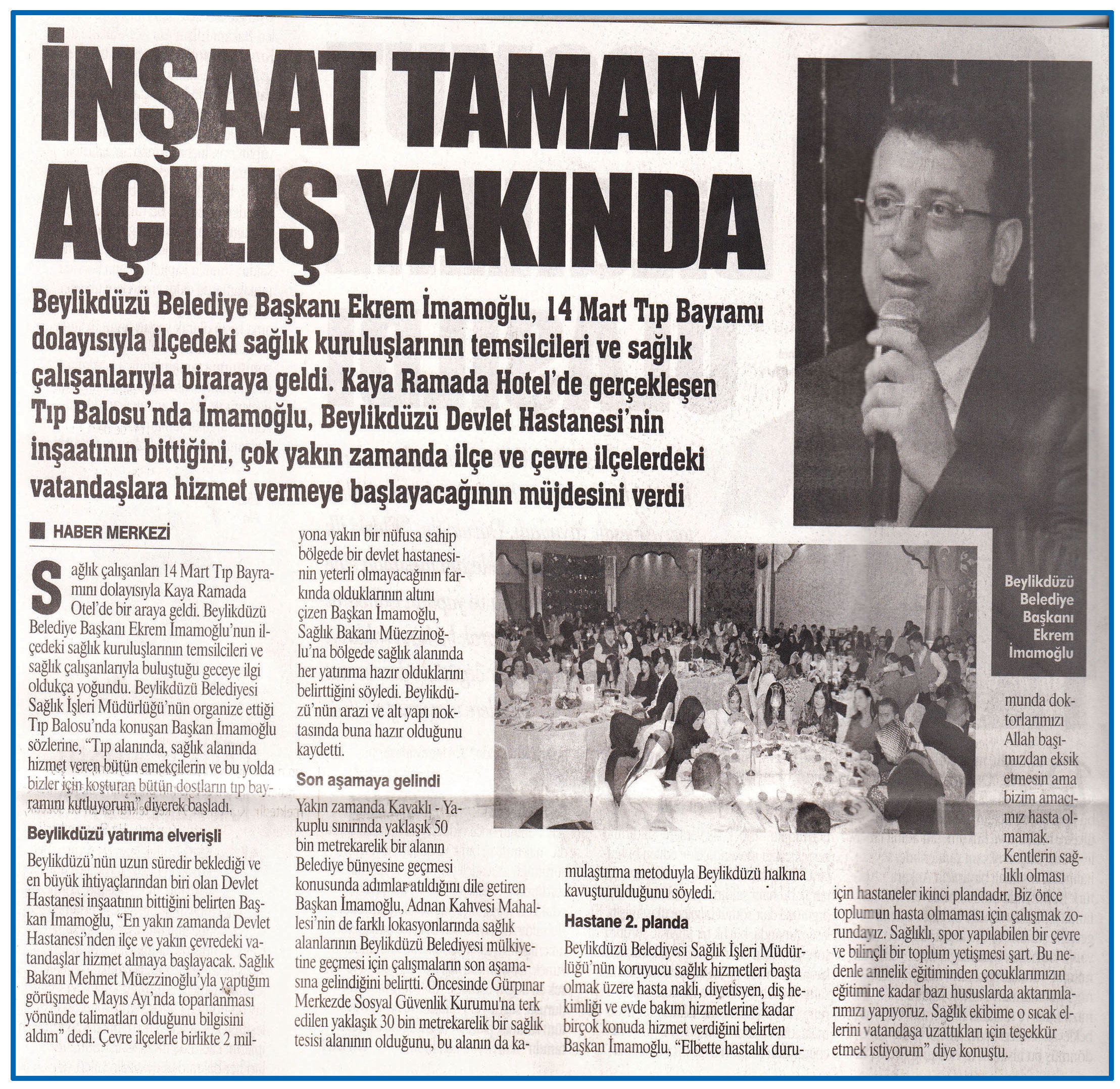 15 Mart 2016 tarihli "GAZETE İSTANBUL" gazetesi. Beylikdüzü Belediye Başkanı Ekrem İmamoğlu, 14 Mart Tıp Bayramı dolayısıyla ilçedeki sağlık kuruluşlarının temsilcileri ve sağlık çalışanlarıyla biraraya geldi.