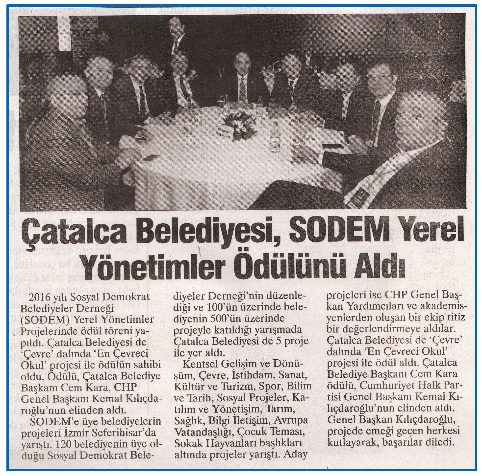 15 Mart 2016 tarihli "BÜYÜKÇEKMECE" gazetesi. 2016 yılı Sosyal Demokrat Belediyeler Derneği (SODEM) Yerel Yönetimler Projelerinde ödül töreni yapıldı. Çatalca Belediyesi de 'Çevre' dalında 'En Çevreci Okul' projesi ile ödülün sahibi oldu. Ödülü, Çatalca Belediye Başkanı Cem Kara, CHP Genel Başkanı Kemal Kılıçdaroğlu'nun elinden aldı.