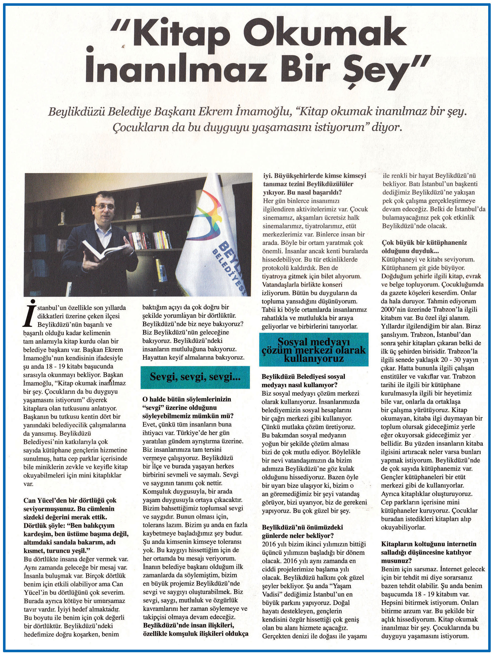 17 Mart 2016 tarihli "BELEDİYE DENİZ" gazetesi. "Beylikdüzü Belediye Başkanı Ekrem İmamoğlu, "Kitap okumak inanılmaz bir şey. Çocukların da bu duyguyu yaşamasını istiyorum" diyor.