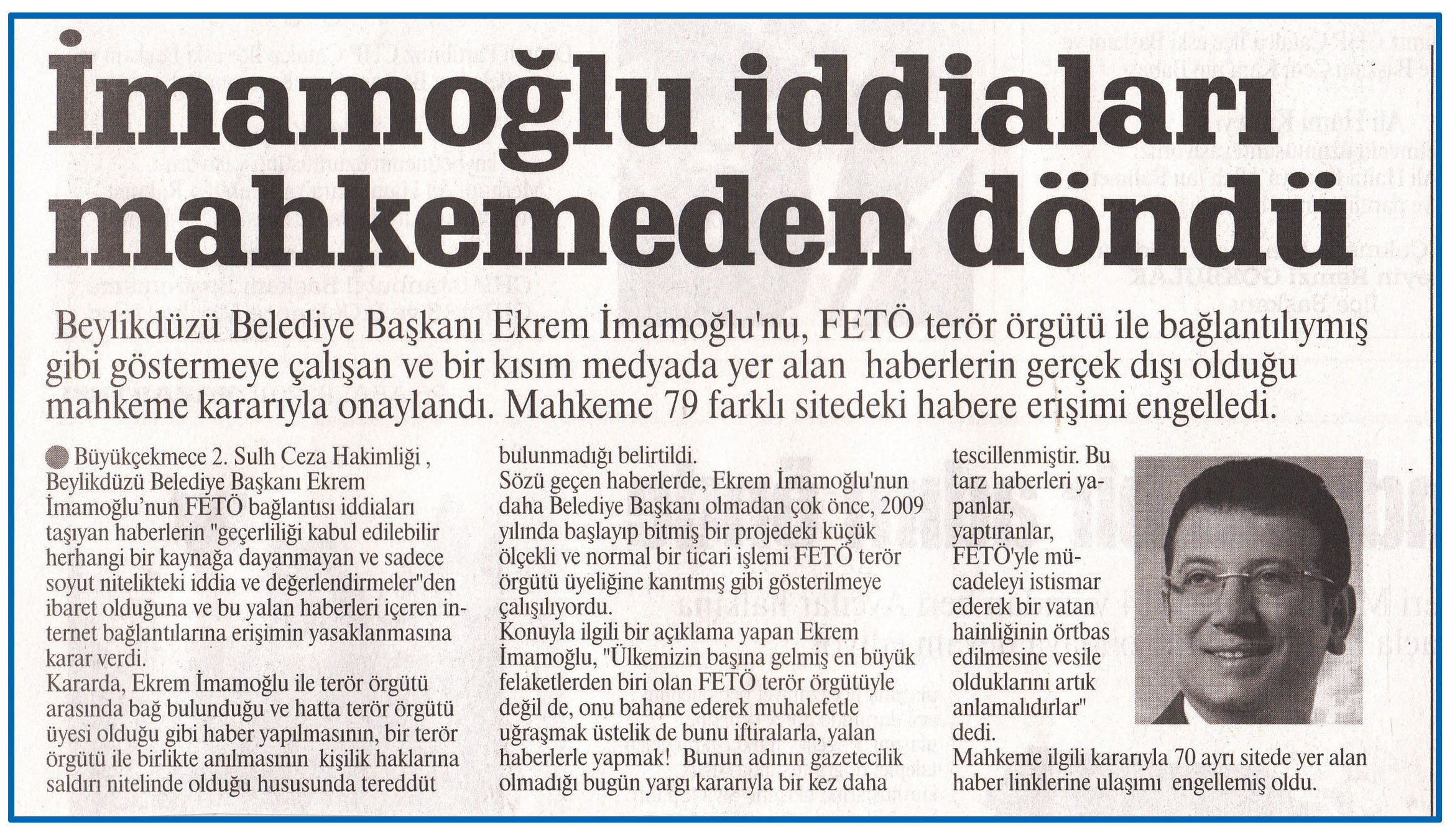 26 Aralık 2016 tarihli "DURUM" gazetesi. Büyükçekmece 2. Sulh Ceza Hakimliği, Beylikdüzü Belediye Başkanı Ekrem İmamoğlu'nun FETÖ bağlantısı iddiaları taşıyan haberlerin geçerliliği kabul edilebilir herhangi bir kaynağa dayanmayan ve sadece soyut nitelikteki iddia ve değerlendirmelerden ibaret olduğuna ve bu yalan haberleri içeren internet bağlantılarına erişimin yasaklanmasına karar verdi.