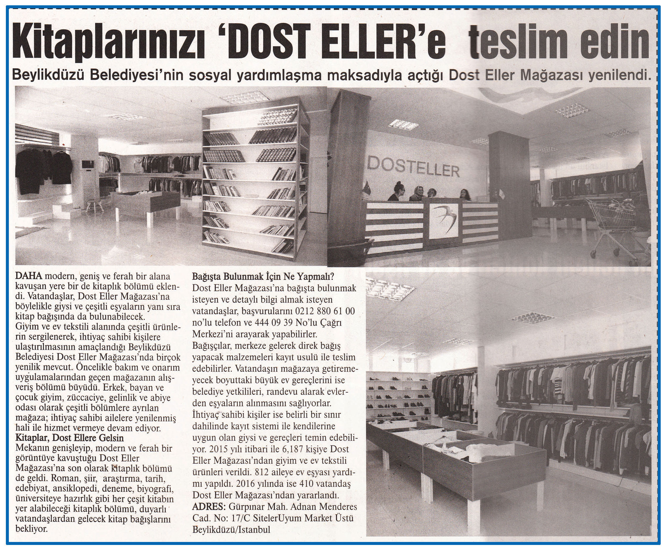 24 Mart 2016 tarihli "MARMARA" gazetesi. Beylikdüzü Belediyesi'nin sosyal yardımlaşma maksadıyla açtığı Dost Eller Mağazası yenilendi. Daha modern, geniş ve ferah bir alana kavuşan yere bir de kitaplk bölümü eklendi. Vatandşlar, Dost Eller Mağazası'na böylelikle giysi ve çeşitli eşyaların yanı sıra kitap bağışında da bulunabilecek.