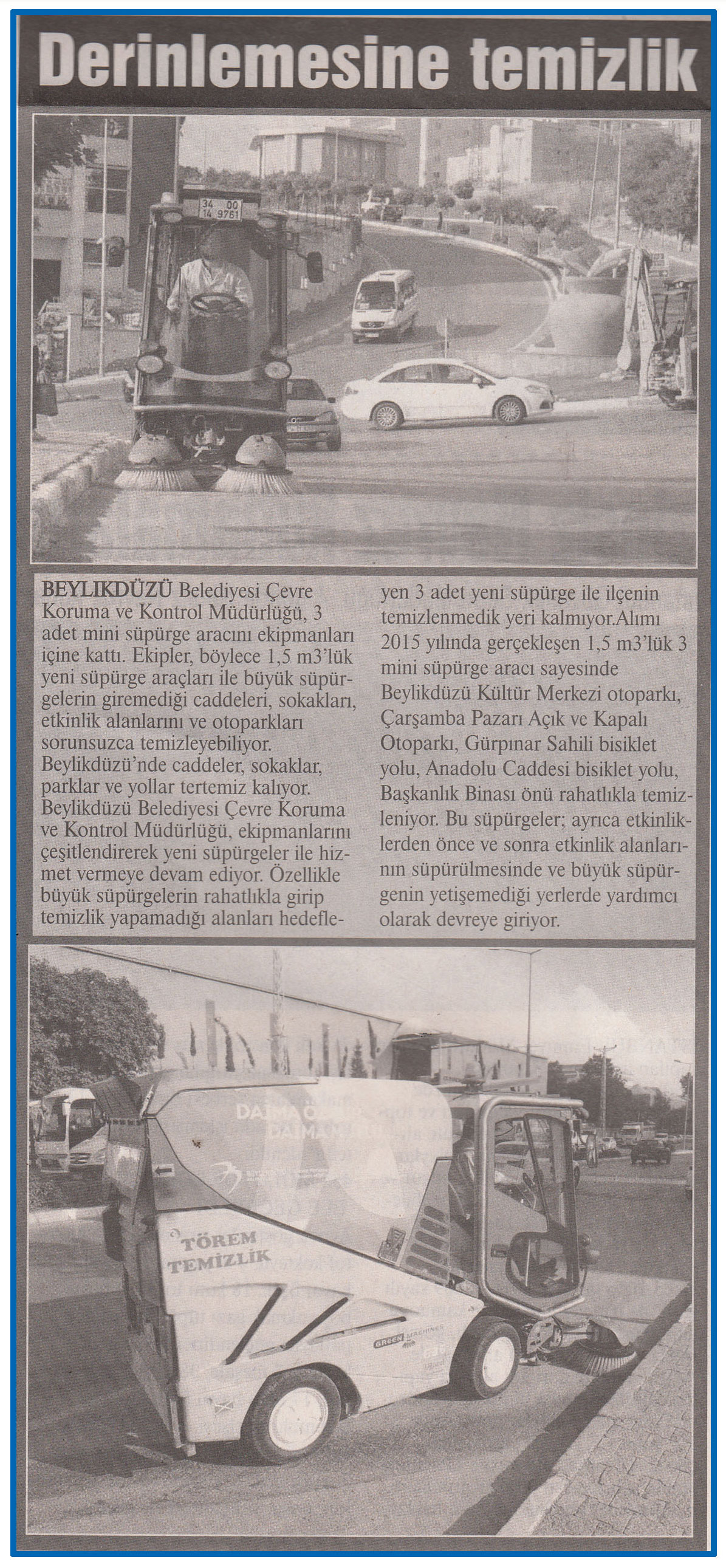 24 Mart 2016 tarihli "MARMARA" gazetesi. Beylikdüü Belediyesi Çevre Koruma ve Kontrol Müdürlüğü, 3 adet mini süpürge aracını ekipmanları içine kattı. Ekipler, böylece 1,5 m³'lük yeni süpürge araçları ile büyük süpürgelerin giremediği caddeleri, sokakları, etkinlik alanlarını ve otoparkları sorunsuzca temizleyebiliyor.