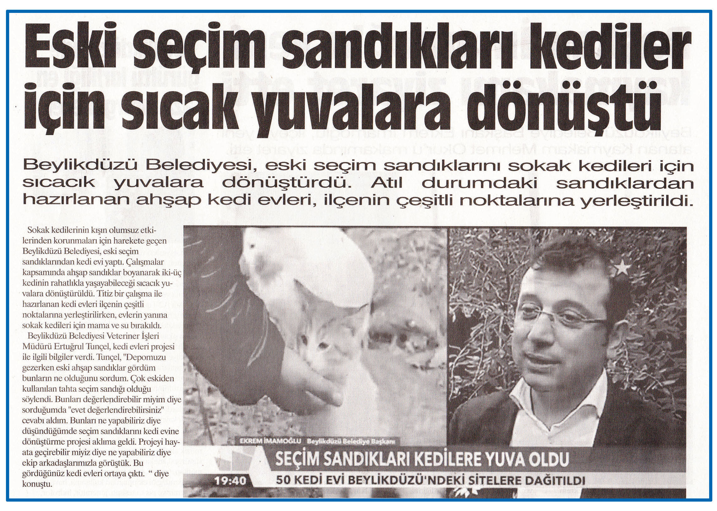 27 Aralık 2016 tarihli "NABIZ" gazetesi. Beylikdüzü Belediyesi, eski seçim sandıklarını sokak kedileri için sıcacık yuvalara dönüştürdü. Atıl durumdaki sandıklardan hazırlanan ahşap kedi evleri, ilçeninin çeşitli noktalarına yerleştirildi. Çalışmalar kapsamında ahşap sandıklar boyanarak iki üç kedinin yaşayabileceği sıcak yuvalara dönüştürüldü.
