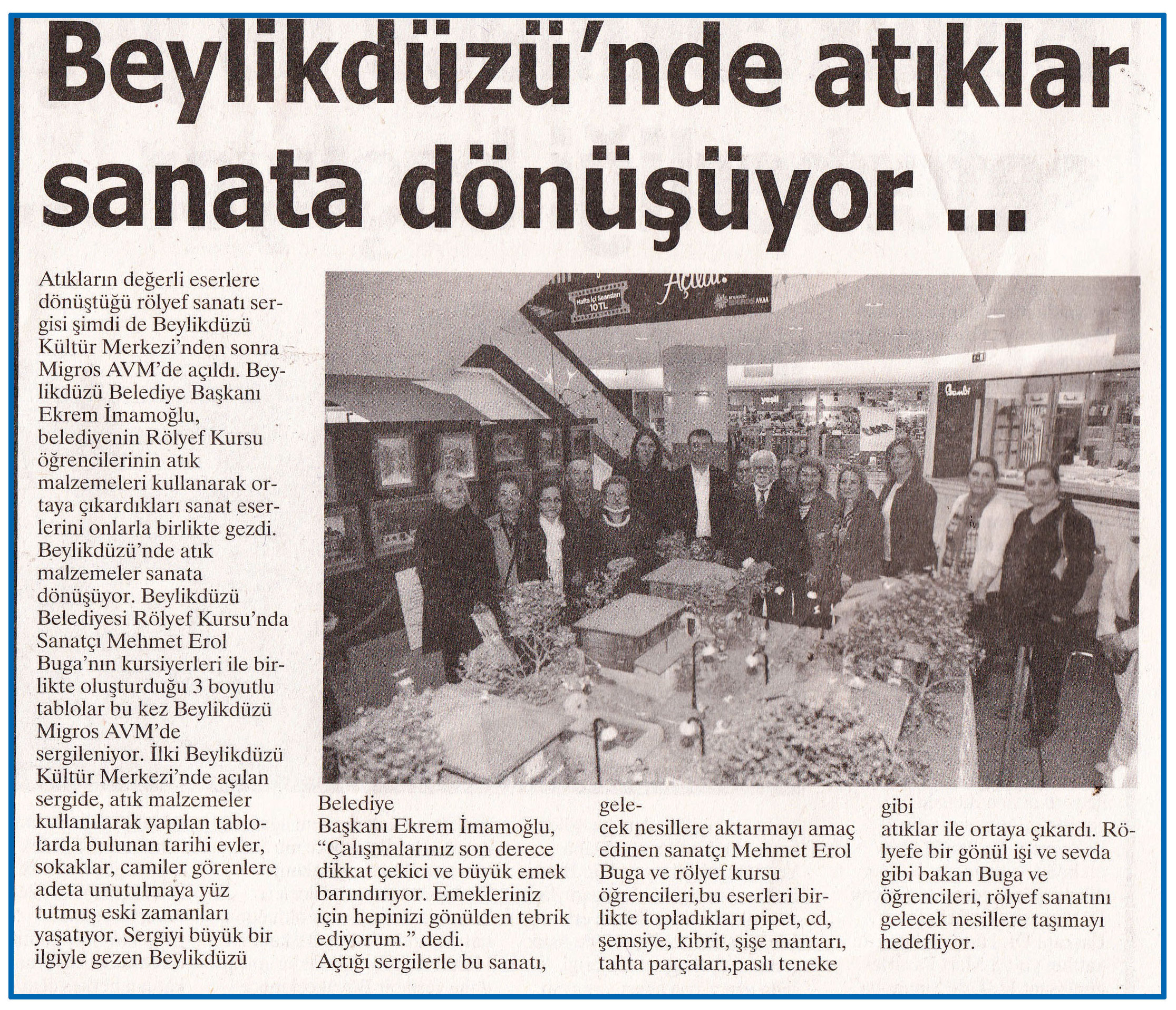 25 Mart 2016 tarihli "NABIZ" gazetesi. Atıklarıın değerli eserlere dönüştüğü rölyef sanatı sergisi şimdi de Beylikdüzü Kültür Merkezi'nden sonra Migros AVM'de açıldı. Beylikdüzü Belediye Başkanı Ekrem İmamoğlu, belediyenin Rölyef Kursu öğrencilerinin tık malzemeleri kullanarak ortaya çıkardıkları sanat eserlerini onlarla birlikte gezdi.