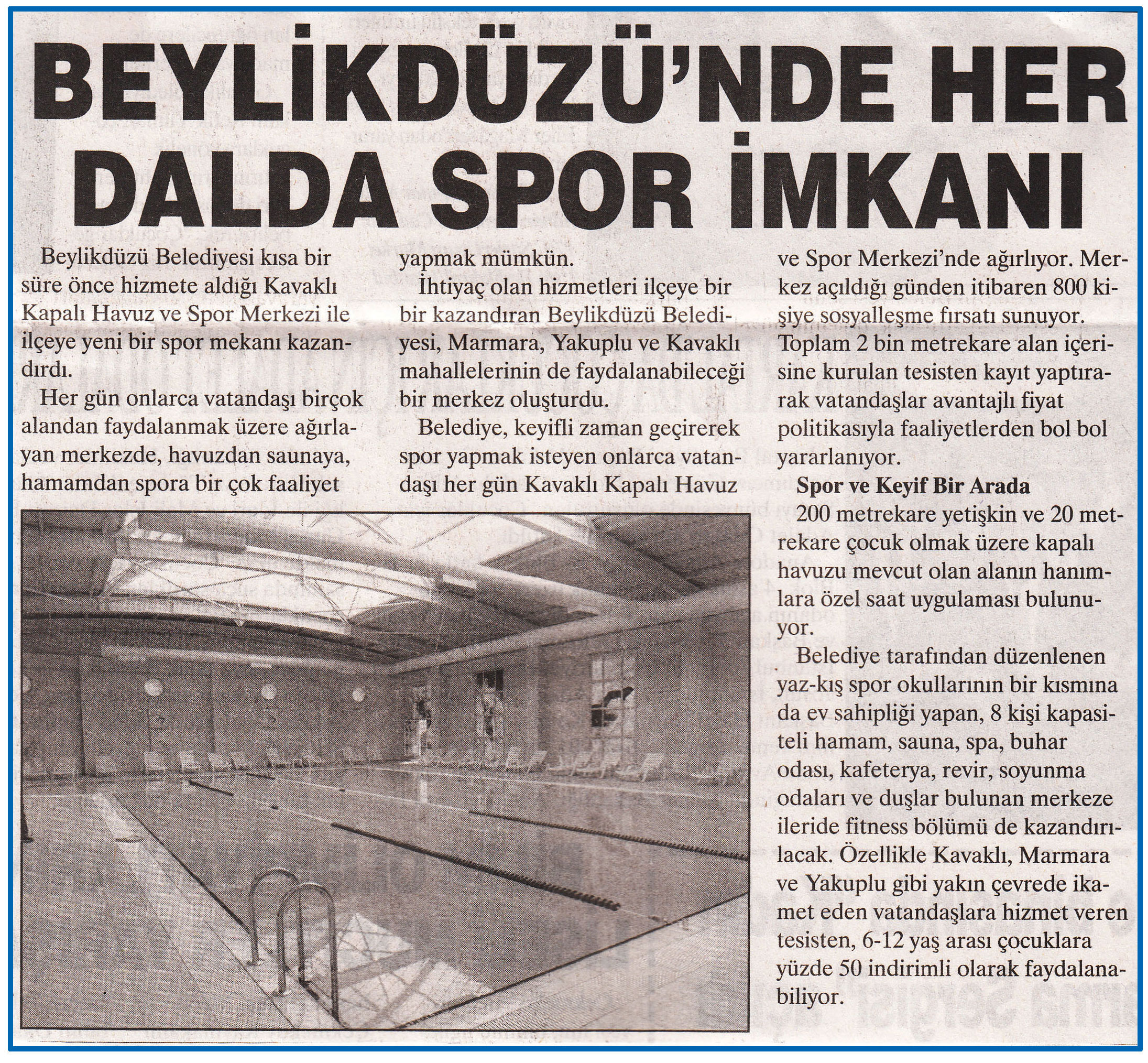 29 Mart 2016 tarihli "YURT HABER" gazetesi. Beylikdüzü Belediyesi kısa bir süre önce hizmete aldığı Kavaklı Kapalı Havuz ve Spor Merkezi ile ilçeye yeni bir spor mekanı kazandırdı.