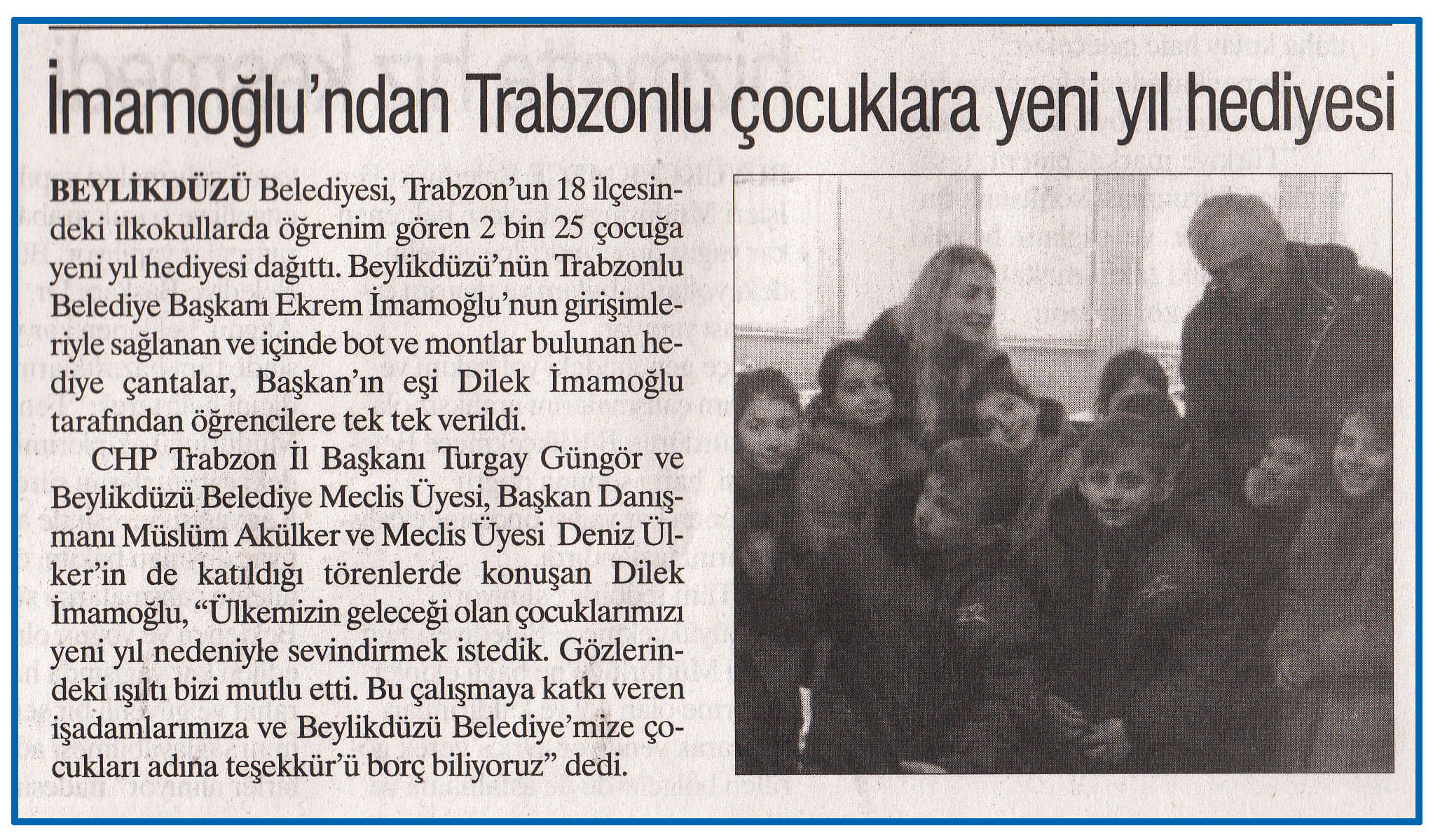 28 Aralık 2016 tarihli "DEĞİŞİM" gazetesi. Beylikdüzü Belediyesi, Trabzon'un 18 ilçesindeki ilkokullarda öğrenim gören 2 bin 25 çocuğa yeni yıl hediyesi dağıttı. Beylikdüzü'nün Trabzonlu Belediye Başkanı Ekrem İmamoğlu'nun girişimleriyle sağlanan ve içinde bot ve montlar bulunan hediye çantalar, Başkan'ın eşi Dilek İmamoğlu tarafından öğrencilere tek tek verildi.