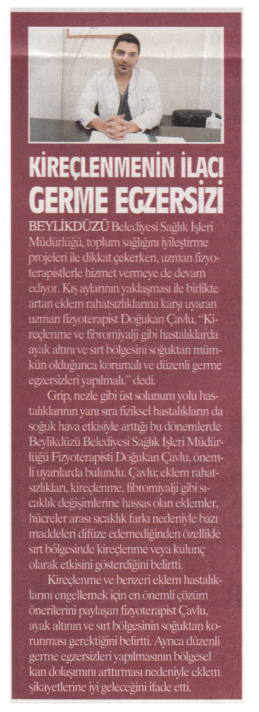 1 Kasım 2016 tarihli ''HABER EKSPRESS'' gazetesi. Beylikdüzü Belediyesi Sağlık İşleri Müdürlüğü, toplum sağlığını iyileştirme projeleri ile dikkat çekerken,uzman fizyoterapistlerle hizmet vermeye de devam ediyor.Kış aylarının yaklaşması ile birlikte artan eklem rahatsızlıklarına karşı uyaran uzman fizyoterapist Doğukan Çavlu,''Kireçlenme ve fibromiyaliji gibi hastalıklarda ayak altını ve sırt bölgesini soğuktan mümkün olduğunca korumalı ve düzenli germe egzersizleri yapılmalı.'' dedi.