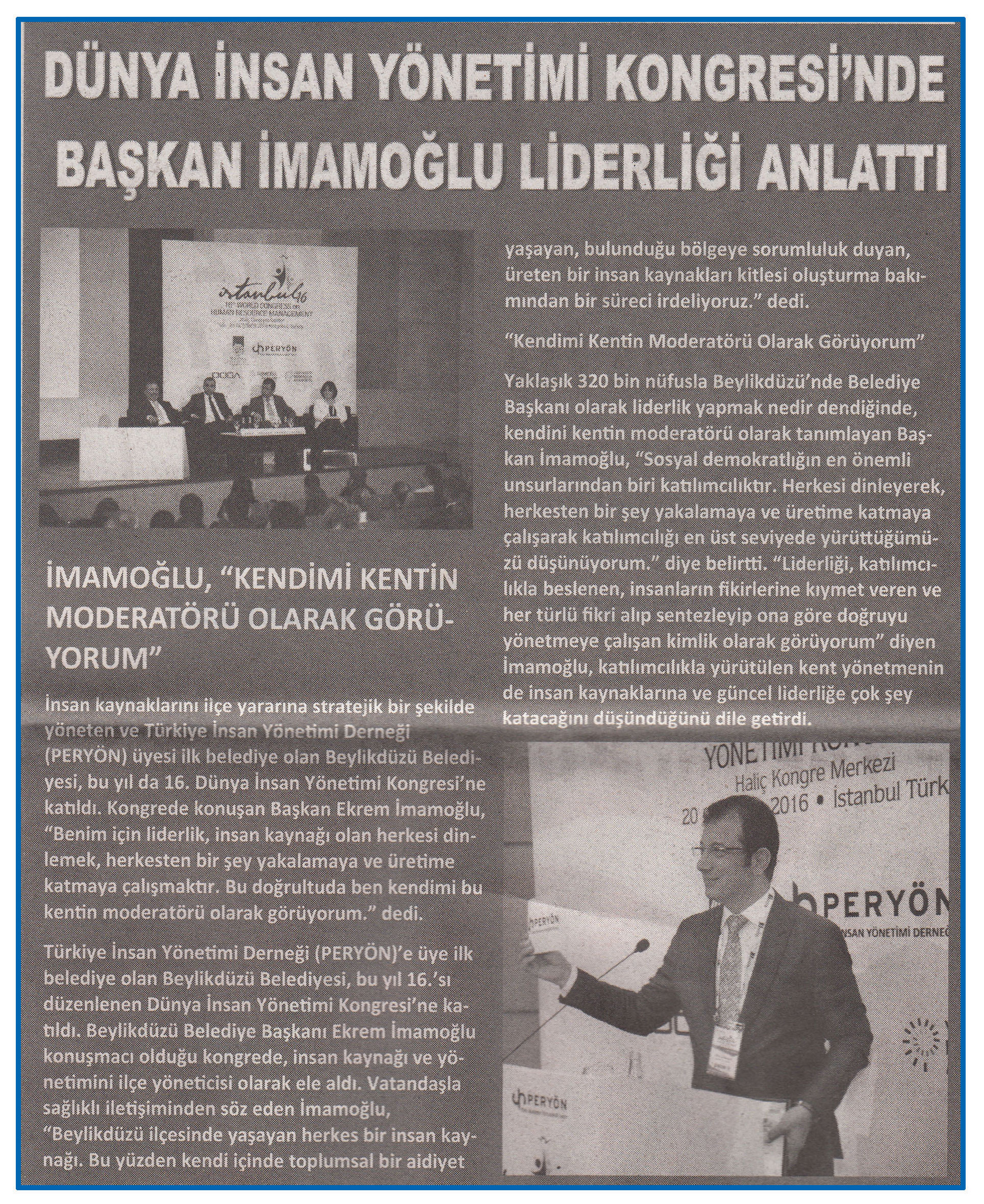 2 Kasım 2016 tarihli ''İSTANBUL GÜNDEMİ''gazetesi. İnsan kaynaklarını ilçe yararına stratejik bir şekilde yöneten ve Türkiye İnsan Yönetimi Derneği(PERYÖN) üyesi ilk belediye olan Beylikdüzü Belediyesi,bu yıl da 16.Dünya İnsan Yönetimi Kongresi'ne katıldı.