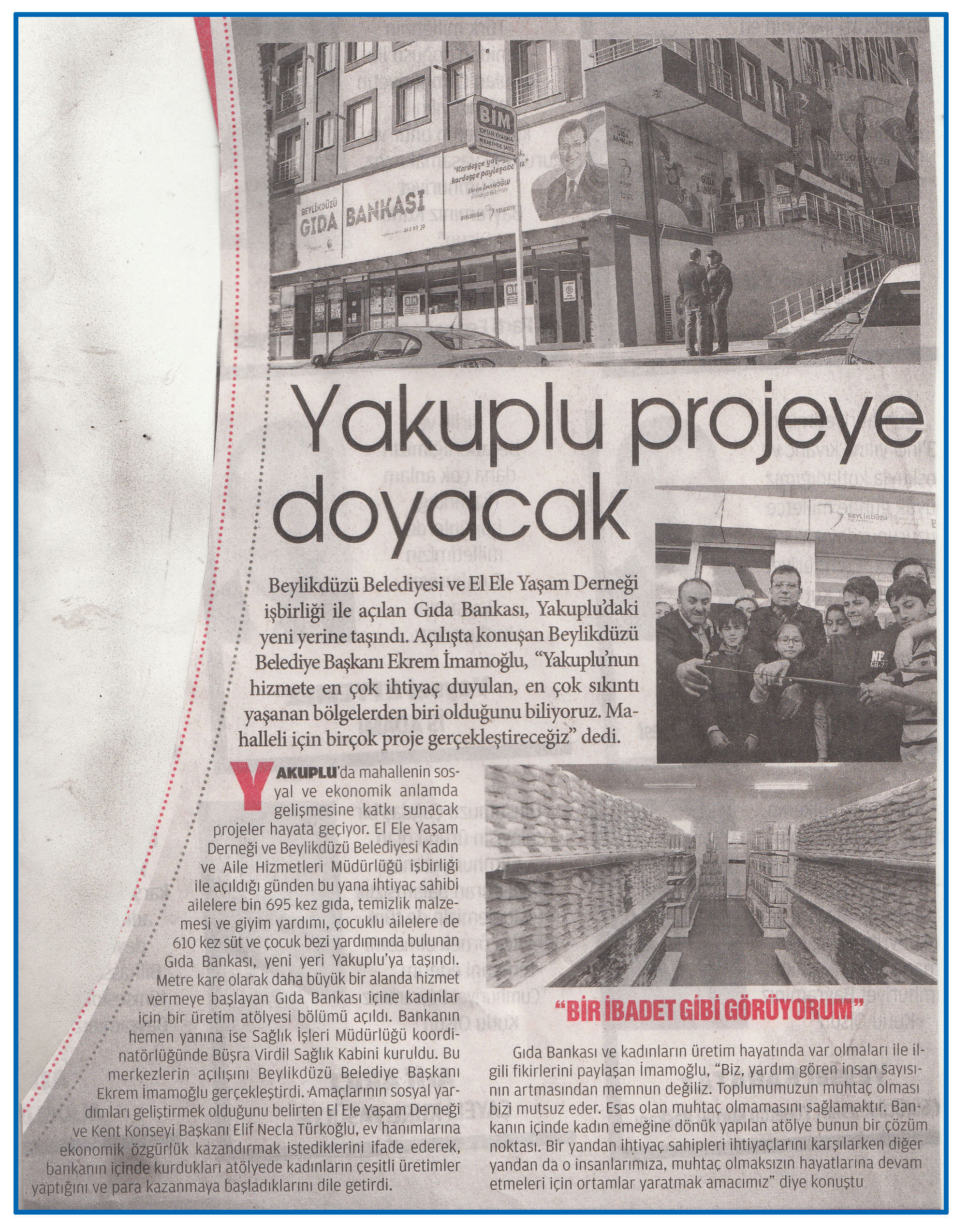 3 Kasım 2016 Tarihli ''ANAHTAR'' gazetesinde. Beylikdüzü Belediyesi ve El Ele Yaşam Derneği işbirliği ile açılan Gıda Bankası,Yakuplu'daki yeni yerine taşındı.Açılışta konuşan Beylikdüzü Belediye Başkanı Ekrem İmamoğlu,''Yakuplu'nun hizmete en çok ihtiyaç duyulan,en çok sıkıntı yaşanan bölgelerden biri olduğunu biliyoruz.Mahalleli için birçok proje gerçekleştireceğiz'' dedi.