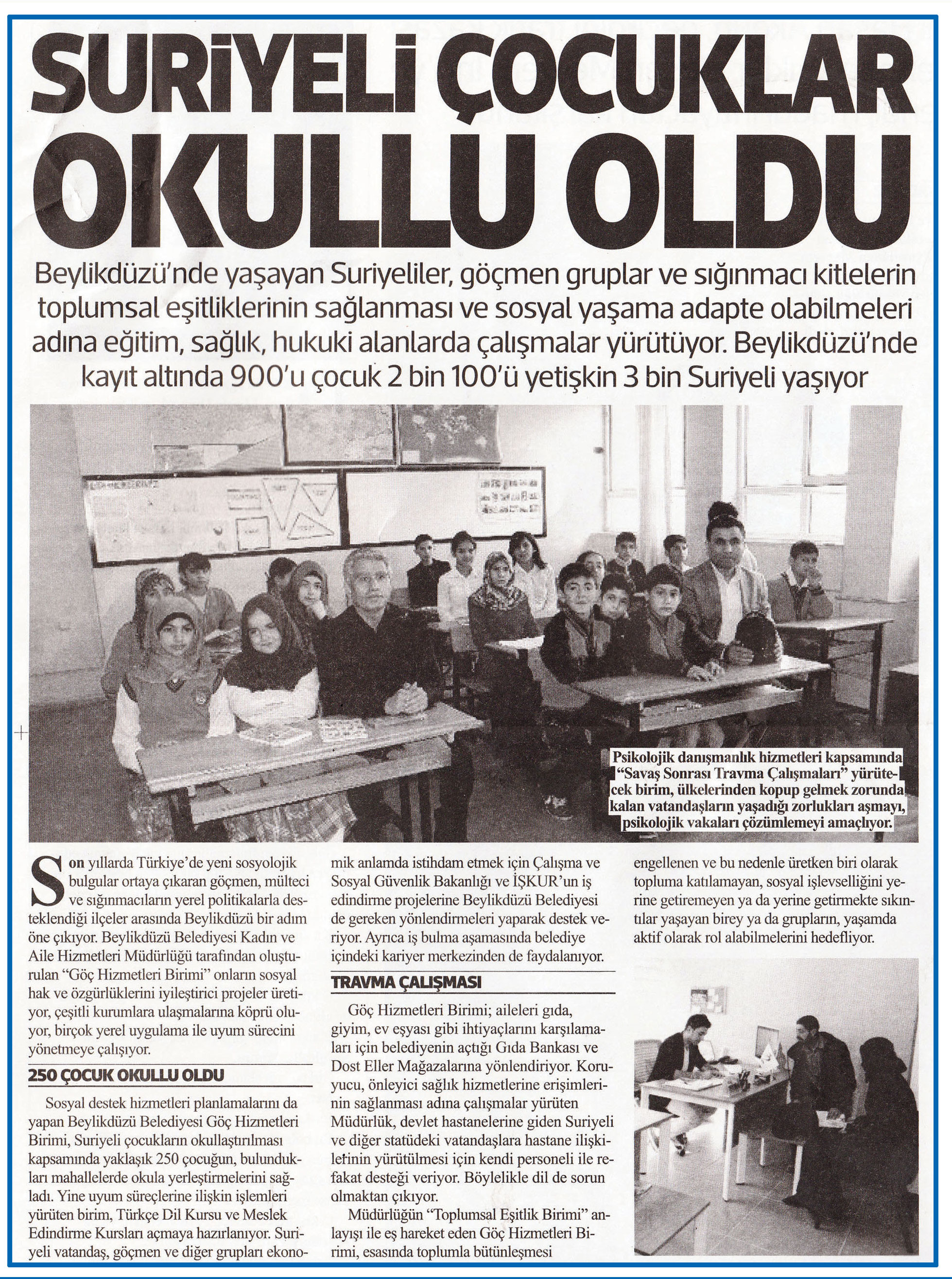 3 Kasım 2016 tarihli ''HABER EKSPRESS'' gazetesinde. Beylikdüzü'nde yaşayan Suriyeliler,göçmen gruplar ve sığınmacı kitlelerin toplumsal eşitliklerinin sağlanması ve sosyal yaşama adapte olabilmeleri adına eğitim,sağlık,hukuki alanlarda çalışmalar yürütüyor.