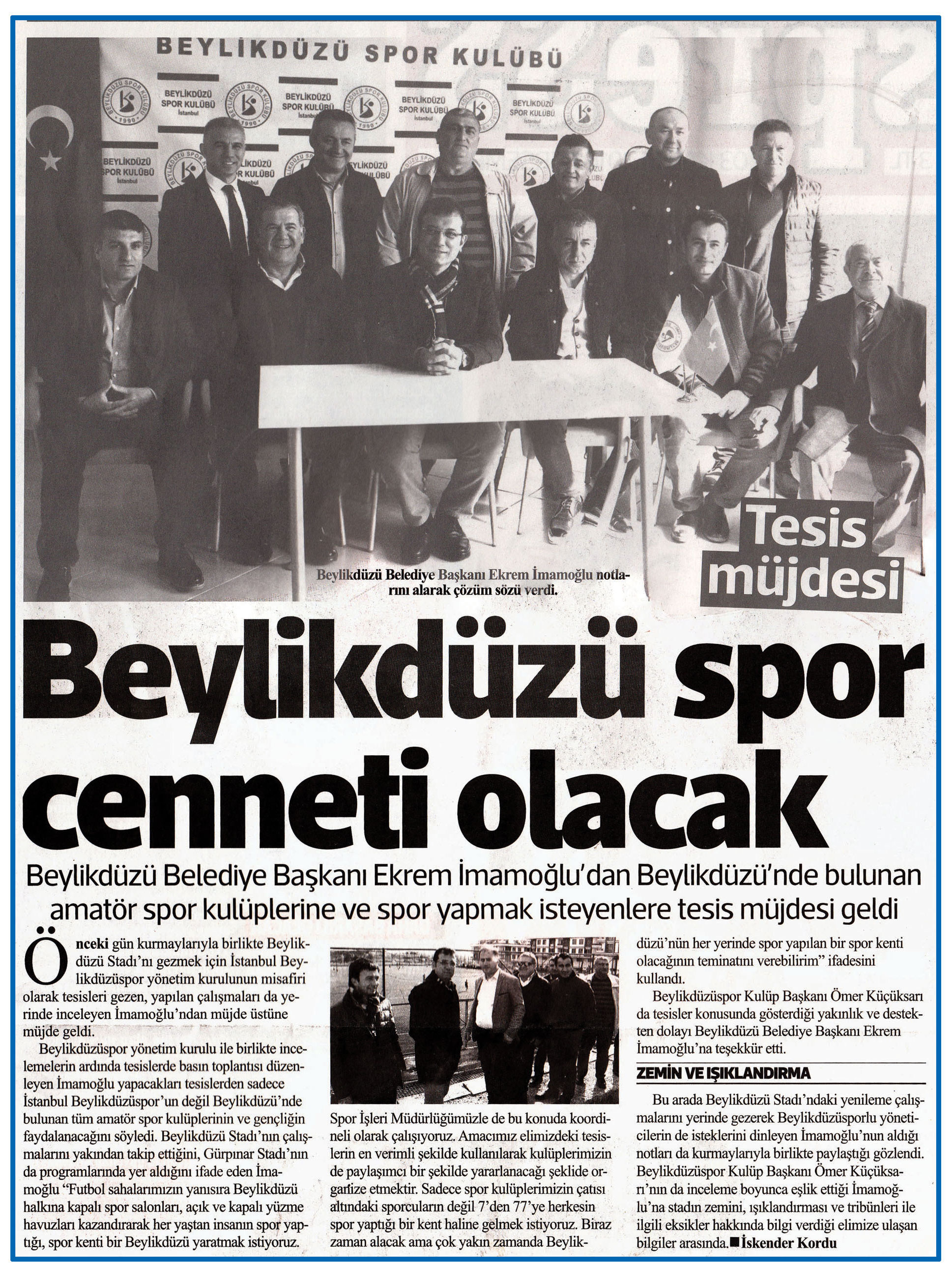 3 Kasım 2016 tarihli ''HABER EKSPRESS'' gazetesinde. Beylikdüzü Belediye Başkanı Ekrem İmamoğlu'ndan Beylikdüzü'nde bulunan amatör spor kulüplerine ve spor yapmak isteyenlere tesis müjdesi geldi.