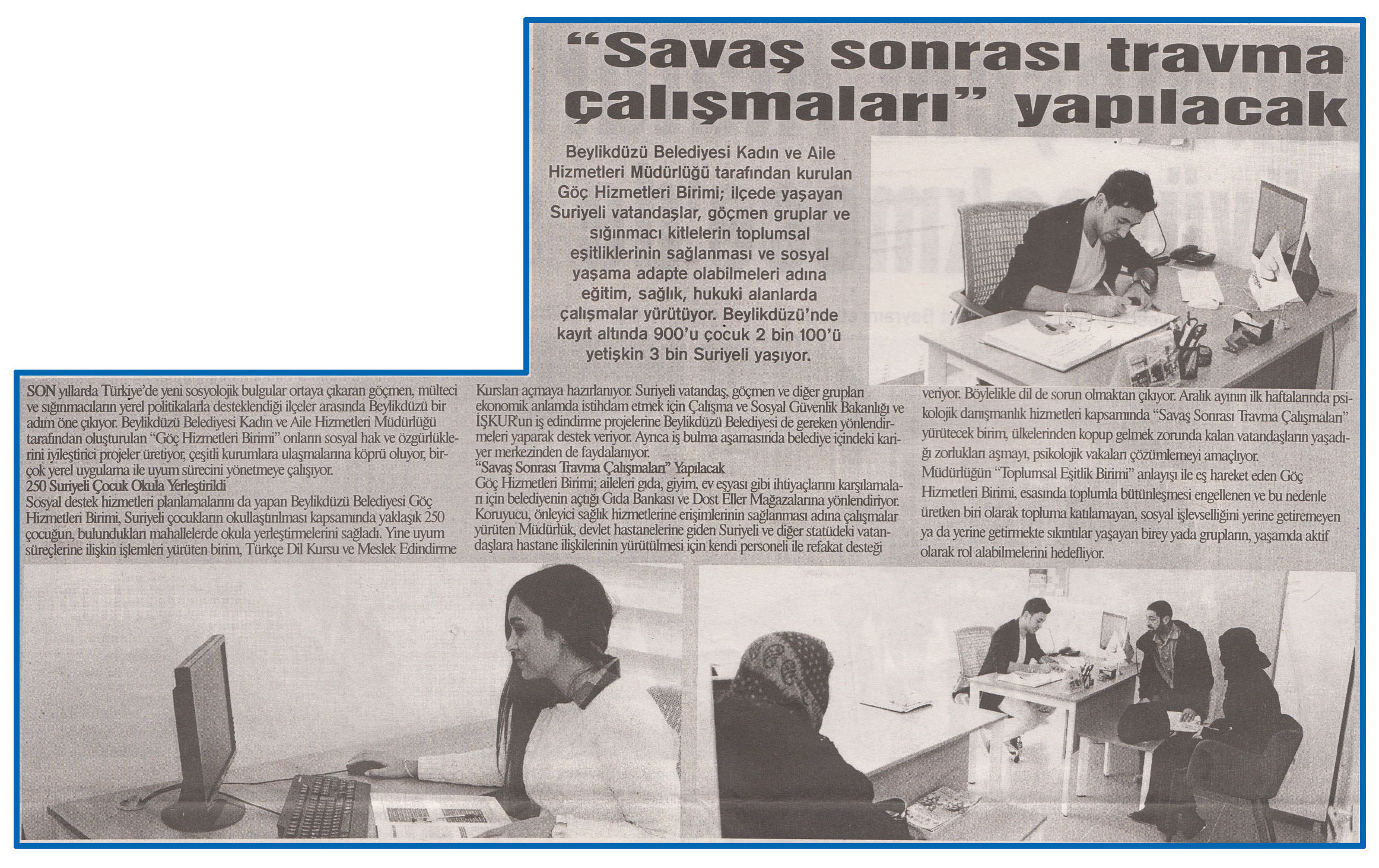 3 Kasım 2016 tarihli ''MARMARA'' gazetesinde. Beylikdüzü Belediyesi Kadın ve Aile Hizmetleri Müdürlüğü tarafından kurulan Göç Hizmetleri Birimi; ilçede yaşayan Suriyeli vatandaşlar,göçmen gruplar ve sığınmacı kitlelerin toplumsal eşitliklerinin sağlanması ve sosyal yaşama adapte olabilmeleri adına eğitim,sağlık,hukuki alanlarda çalışmalar yürütüyor.Beylikdüzü'nde kayıt altında 900'u çocuk 2 bin 100'ü yetişkin 3 bin suriyeli yaşıyor.