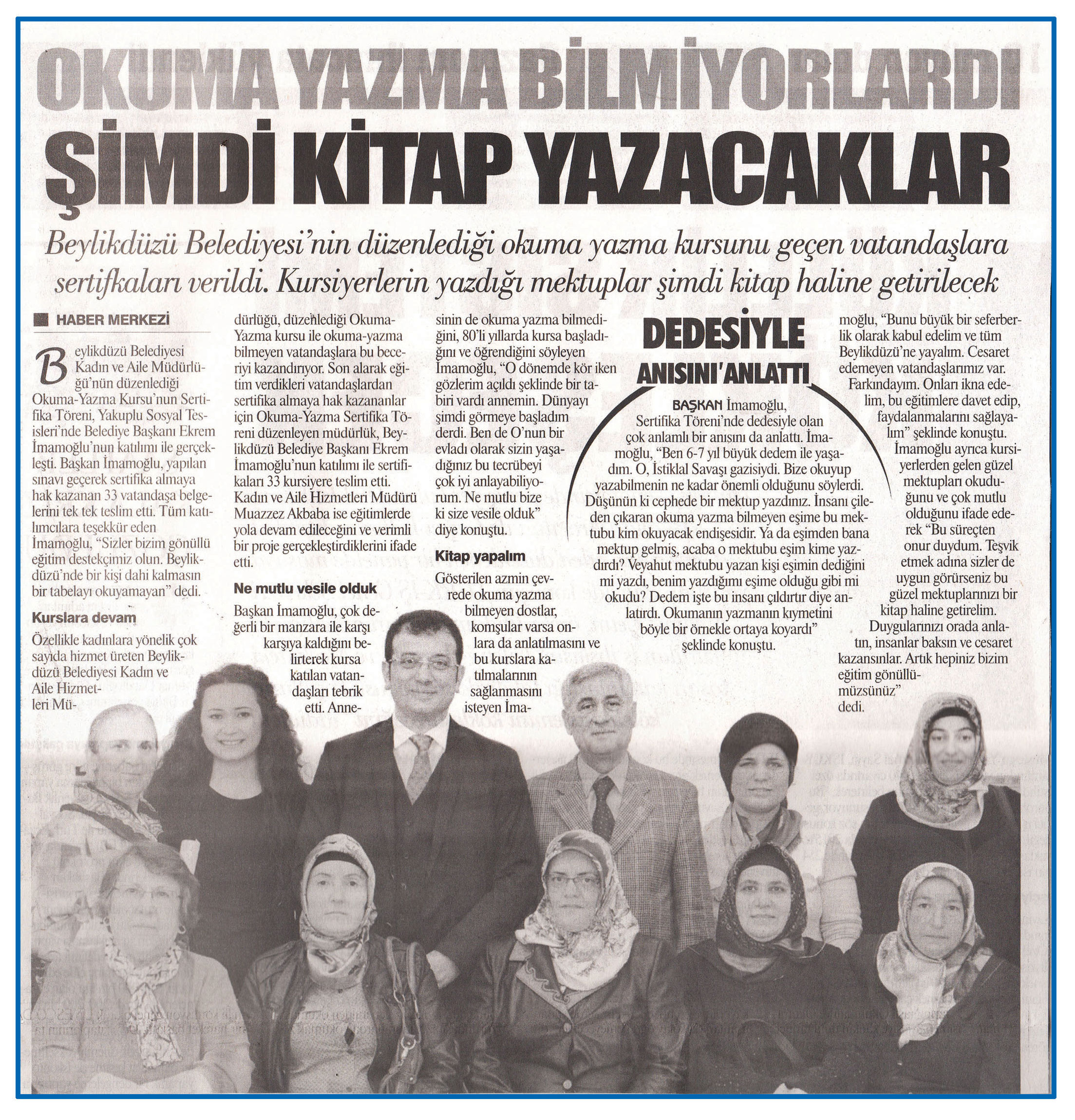 4 Nisan 206 tarihli "GAZETE İSTANBUL" gazetesi. Beylikdüzü Belediyesi'nin düzenlediği okuma yazma kursunu geçen vatandaşlara sertifikaları verildi. Kursiyerlerin yazdığı mektuplar şimdi kitap haline getirilecek.