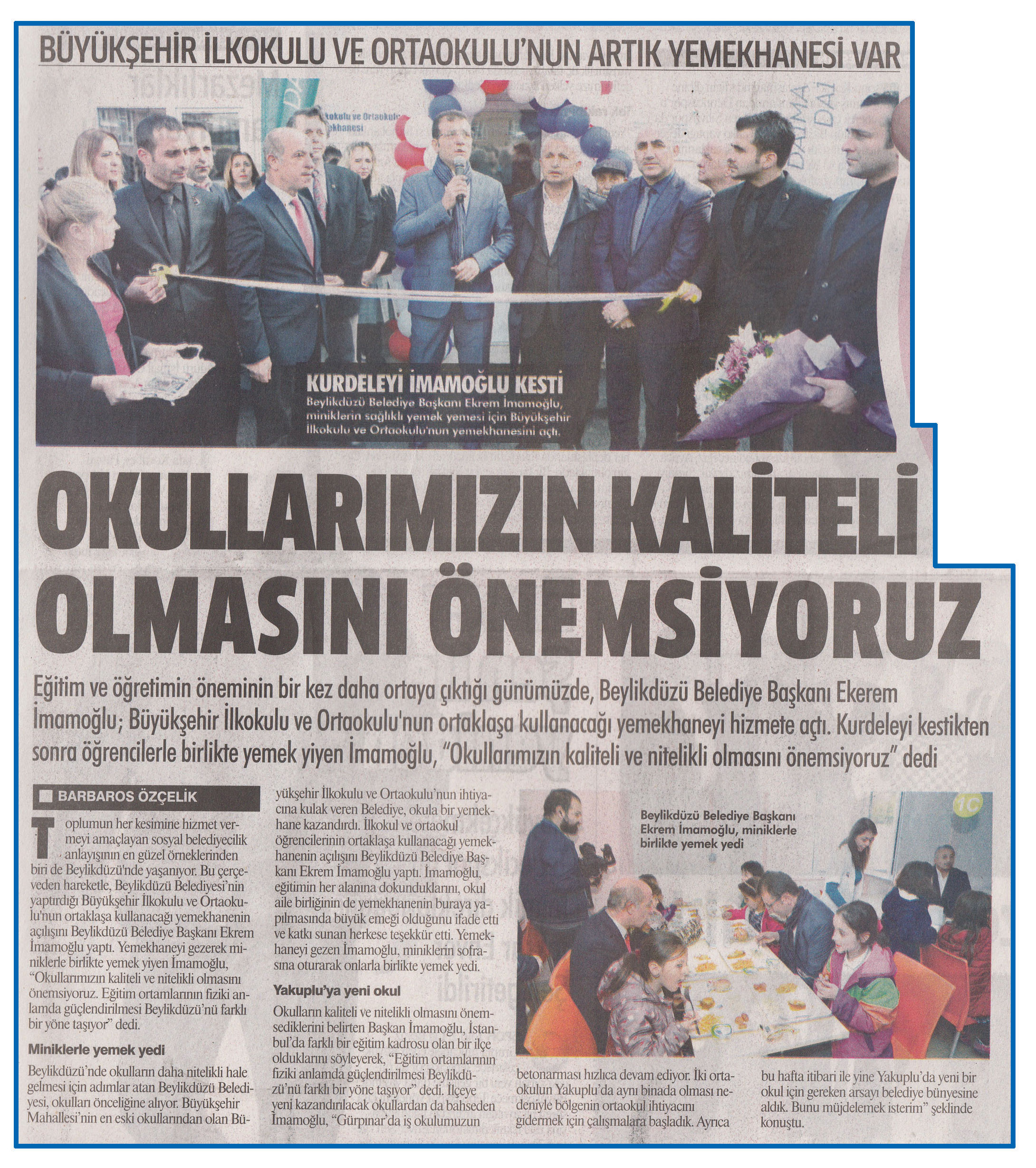 4 Kasım 2016 tarihli ''GAZETEM İSTANBUL'' gazetesi. Eğitim ve öğretimin bir kez daha ortaya çıktığı günümüzde,Beylikdüzü Belediye Başkanı Ekrem İmamoğlu;Büyükşehir İlkokul ve Ortaokulu'nun ortaklaşa kullanacağı yemekhaneyi hizmete açtı.Kurdeleyi kestikten sonra öğrencilerle beraber yemek yiyen İmamoğlu,''Okullarımızın kaliteli ve nitelikli olmasını önemsiyoruz''dedi.