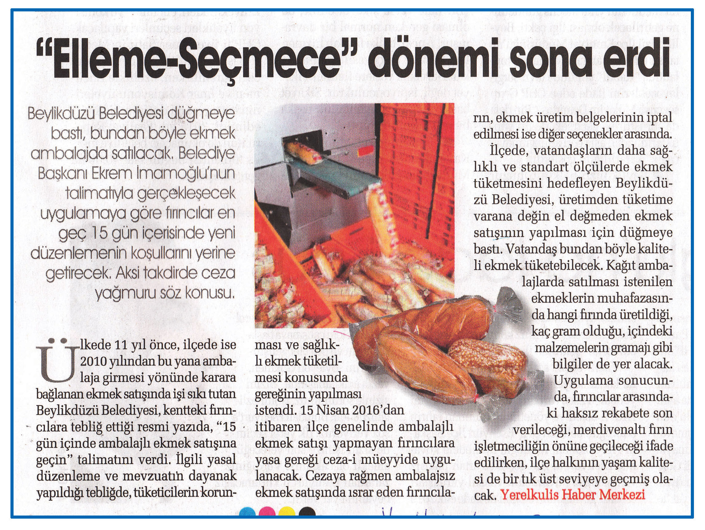 4 Nisan 2016 tarihli "YERELKULİS" gazetesi. Beylikdüzü Belediyesi düğmeye bastı, bundan böyle ekmek ambalajda satılacak. Belediye Başkanı Ekrem İmamoğlu'nun talimatıyla gerçekleşecek uygulamaya göre fırıncılar en geç 15 gün içerisinde yeni düzenlemenin koşulları yerine getirecek. Aksi takdirde ceza yağmuru söz konusu.