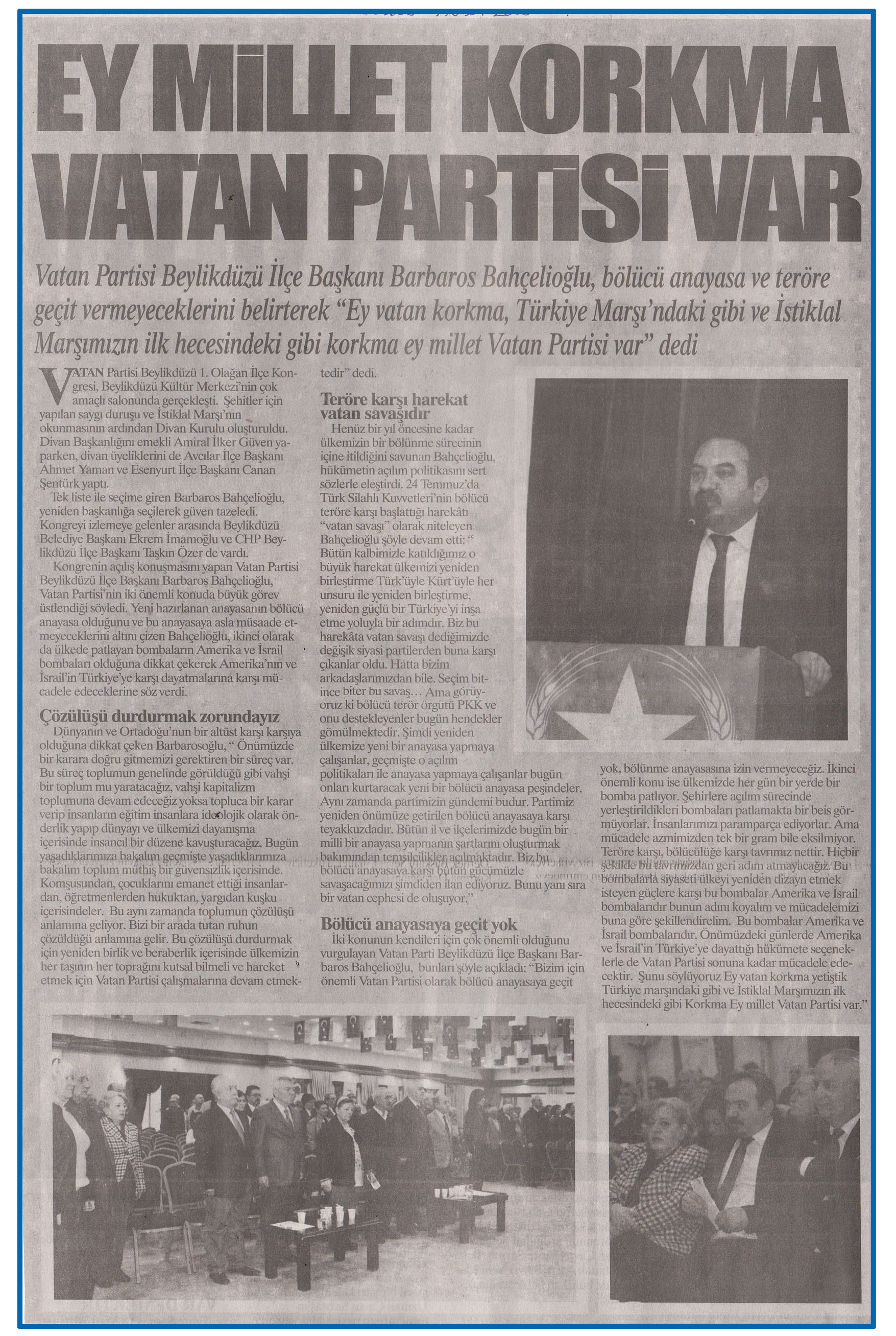 5 Nisan 2016 tarihli "ANAHABER" gazetesi. Vatan Partisi Beylikdüzü İlçe Başkanı Barbaros Bahçelioğlu, bölücü anayasa ve teröre geçit vermeyeceklerini belirterek "Ey vatan korkma, Türkiye Marşı'ndaki gibi ve İstiklal Marşımızın ilk hecesindeki gibi korkma ey millet Vatan Partisi var" dedi.
