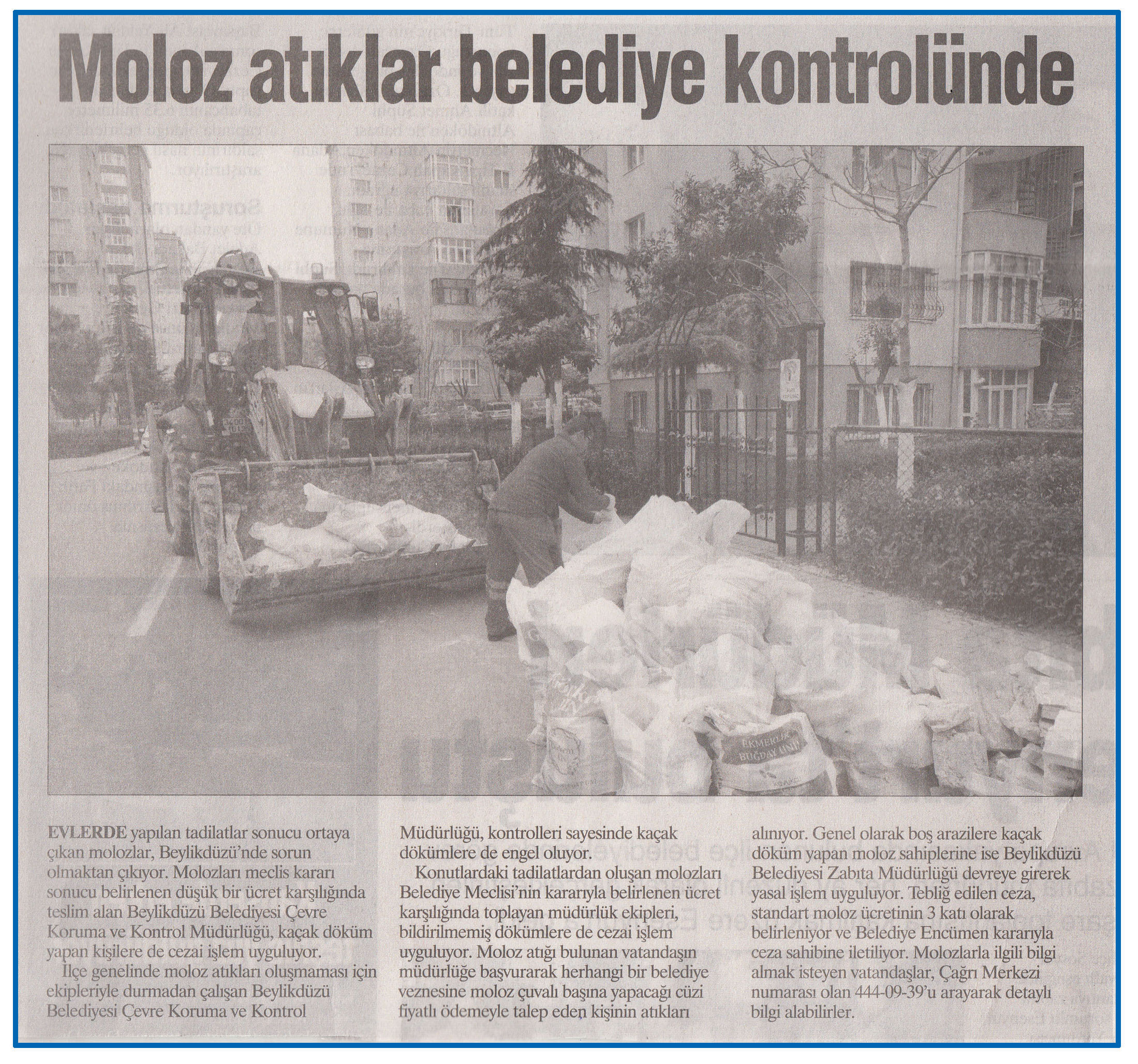 13 Nisan 2016 tarihli "KENT HABER" gazetesi. Evlerde yapılan tadilatlar sonucu ortaya çıkan molozlar, Beylikdüzü'nde sorun olmaktan çıkıyor. Molozları meclis kararı sonucu belirlenen düşük bir ücret karşılığında teslim alan Beylikdüzü Belediyesi Çevre Koruma ve Kontrol Müdürlüğü, kaçak döküm yapan kişilere de cezai işlem uyguluyor.