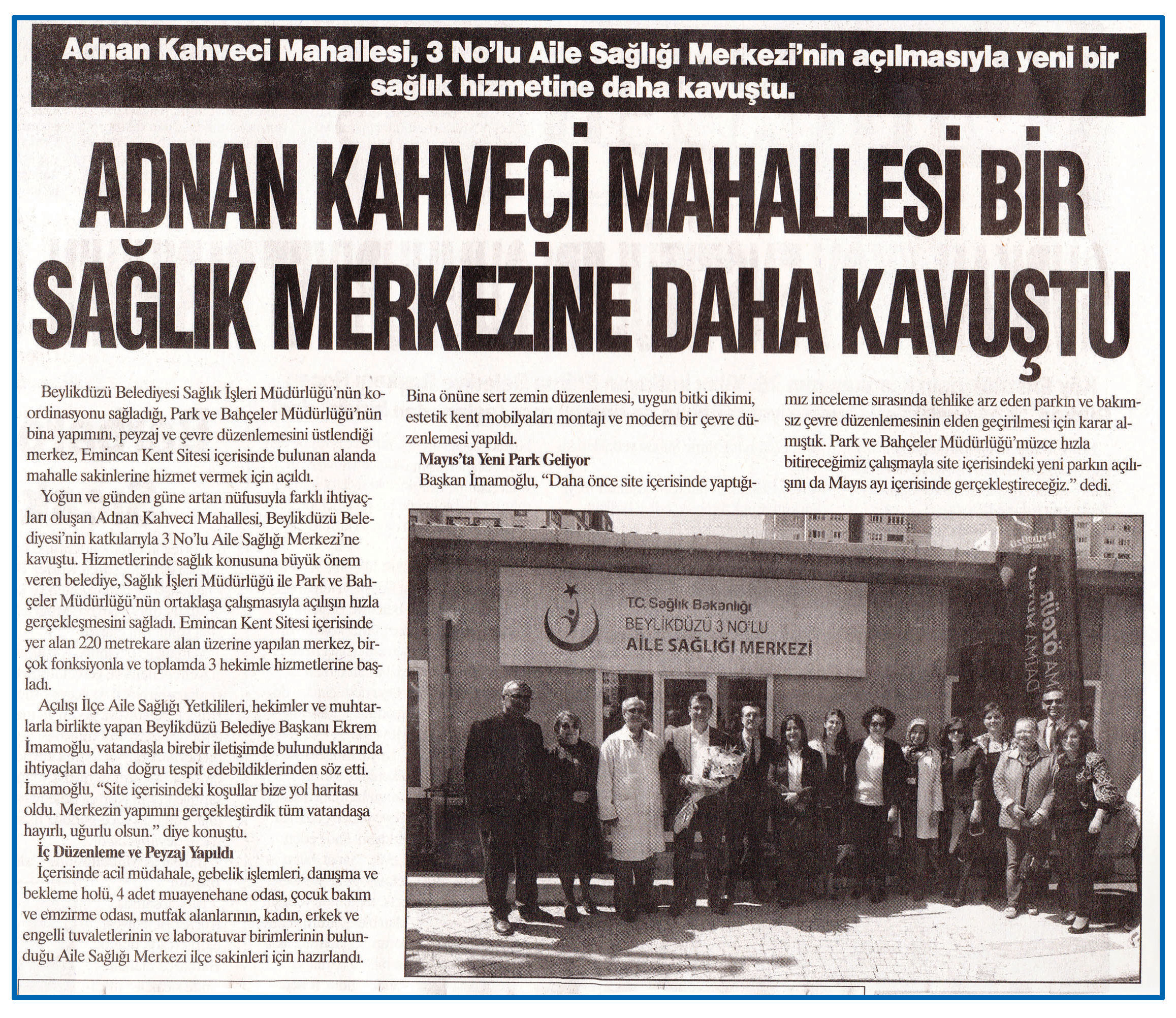 15 Nisan 2016 tarihli "YURT HABER" gazetesi. Beylikdüzü Belediyesi Sağlık İşleri Müdürlüğü'nün koordinasyonu sağladığı, Park ve Bahçeler Müdürlüğü'nün bina yapımını, peyzaj ve çevre düzenlemesini üstlendiği merkez, Emincan Kent Sitesi içerisinde bulunan alanda mahalle sakinlerine hizmet vermek için açıldı.