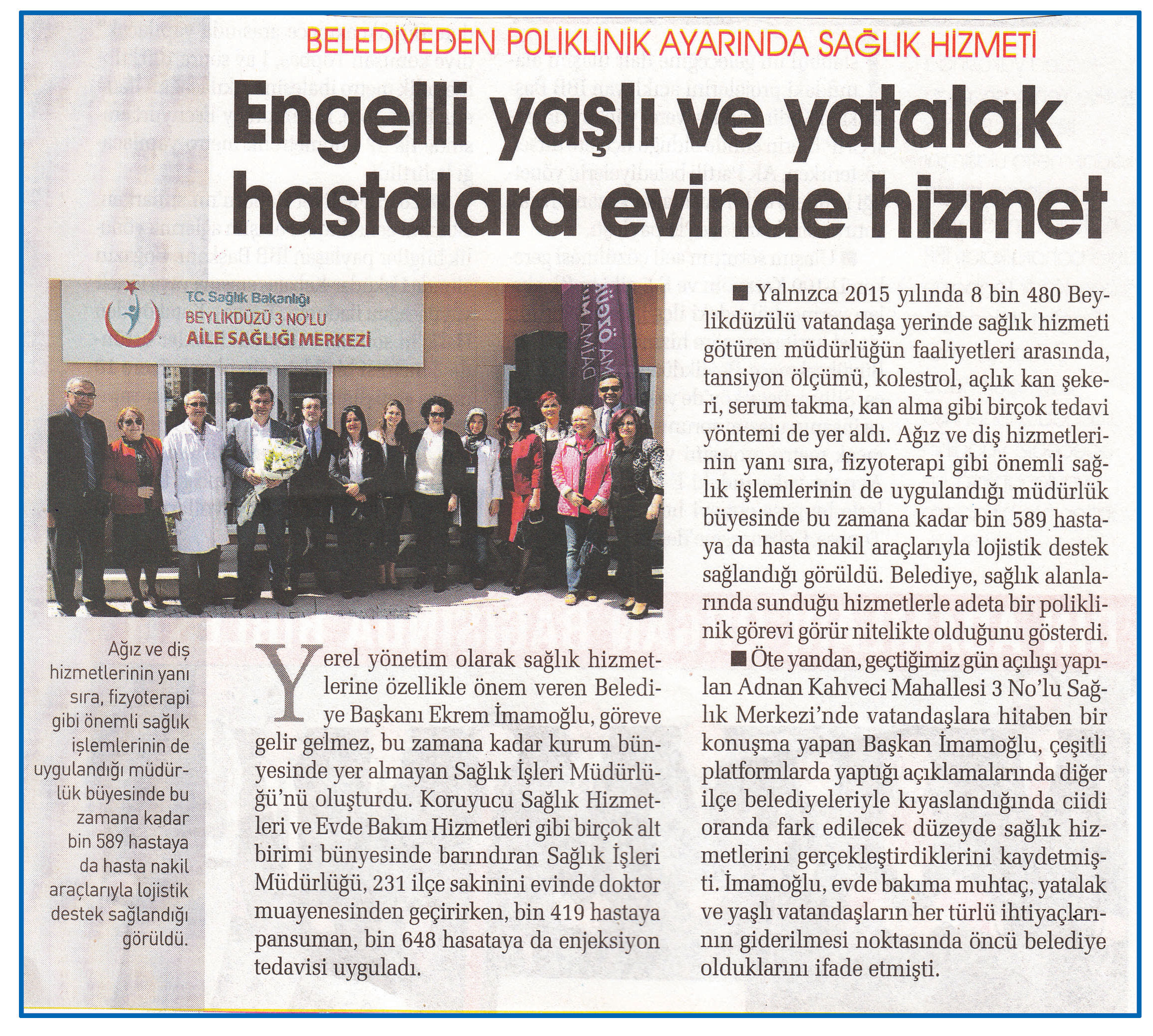18 Nisan 2016 tarihli "YERELKULİS" gazetesi. Yerel yönetim olarak sağlık hizmetlerine özellikle önem veren Belediye Başkanı Ekrem İmamoğlu, göreve gelir gelmez, bu zamana kadar kurum bünyesinde yer almayan Sağlık İşleri Müdürlüğü'nü oluşturdu.