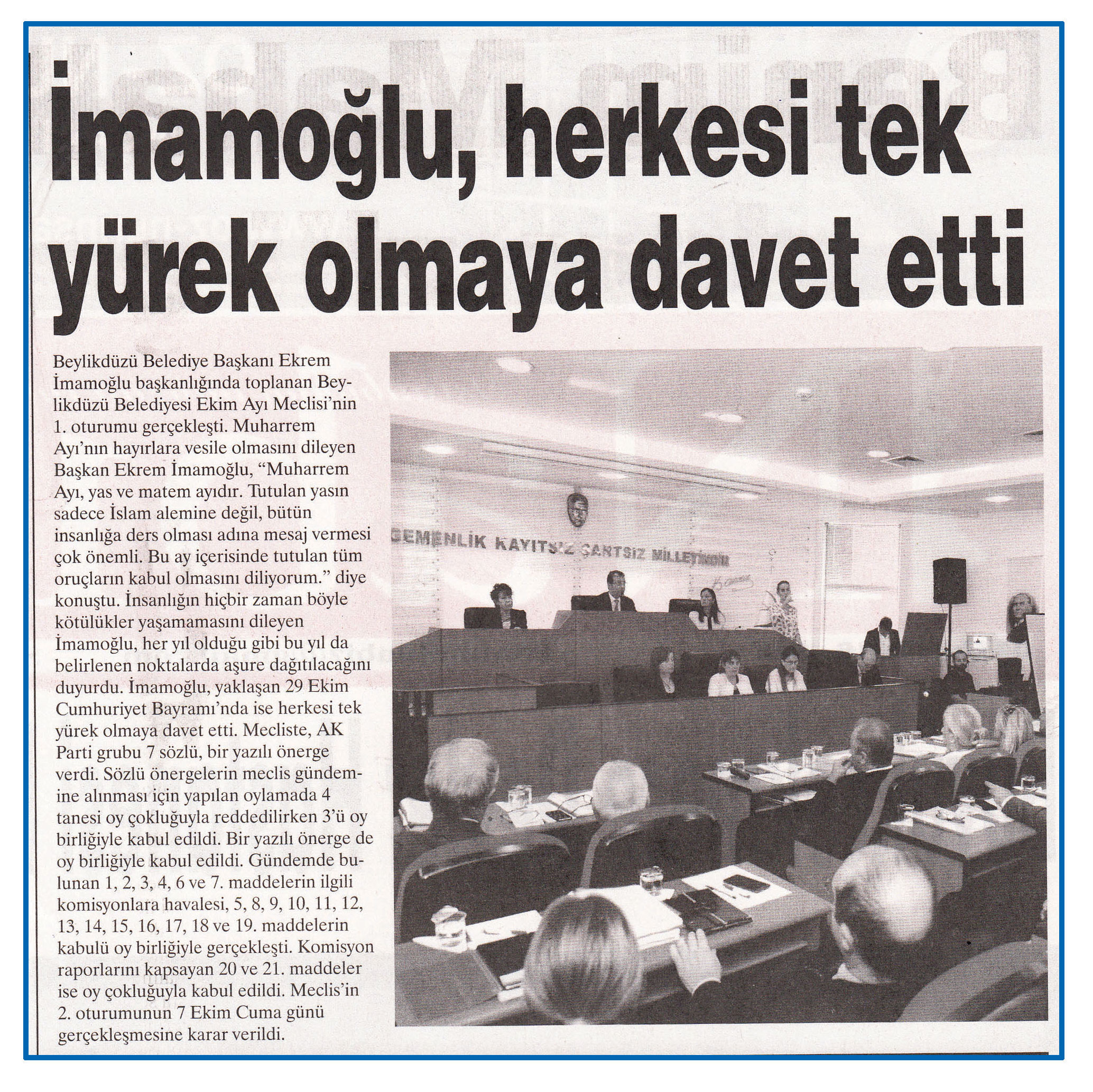 4 Ekim 2016 tarihli "NABIZ" gazetesi. Beylikdüzü Belediye Başkanı Ekrem İmamoğlu başkanlığında toplanan Beylikdüzü Belediyesi Ekim Ayı Meclisi'nin 1. oturumu gerçelleşti. İmamoğlu Muharrem Ayı'nın hayırlara vesile olması temenilerini iletirken, yaklaşan 29 Ekim Cumhuriyet Bayramı için ise herkesi tek yürek olmaya davet etti.